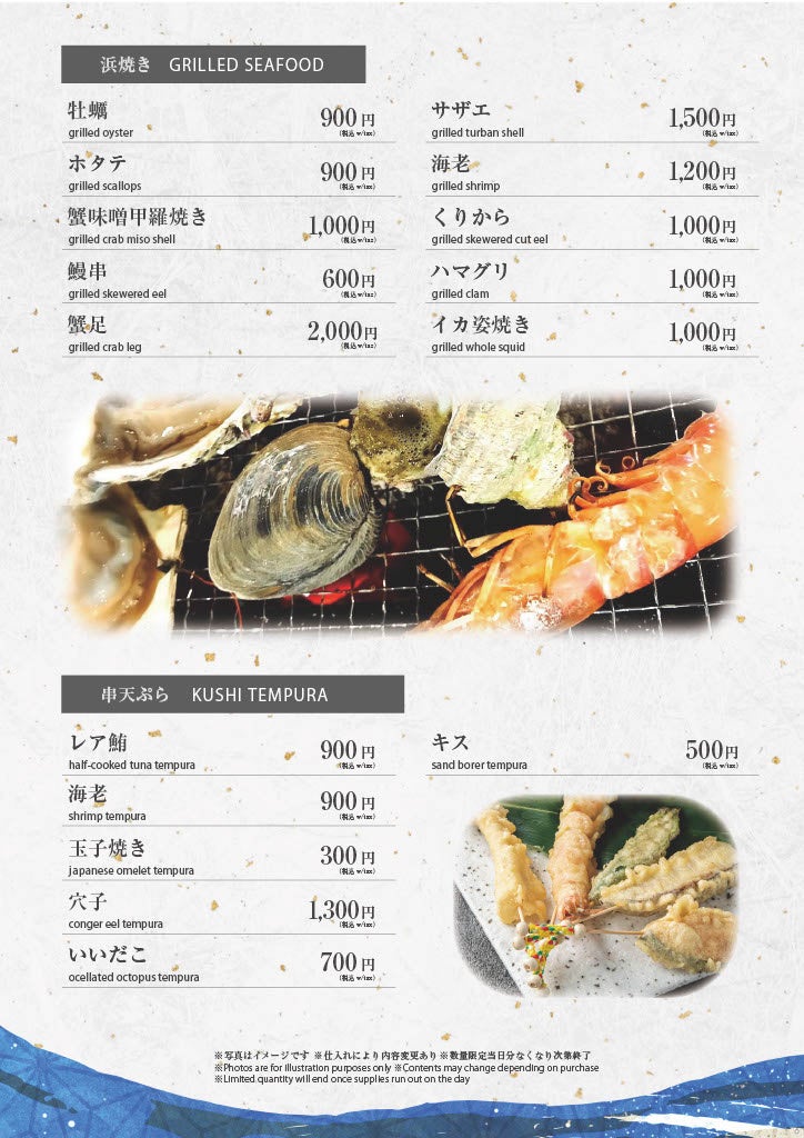 築地ならではの食べ歩きを楽しめるお手軽メニューで、豊洲から仕入れるマグロ3貫をつまむも良し。焼き牡蠣を楽しむも良し。串天ぷらを食べながら築地を練り歩くも良し。美味しく楽しく食べ歩きを。
