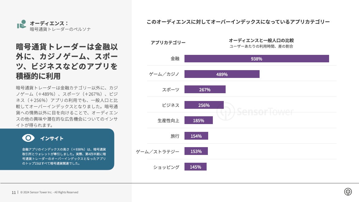 暗号通貨トレーダーは金融カテゴリー以外に、カジノゲーム(+489%)、スポーツ(+267%)、ビジネス(+256%)アプリの利用でも、一般人口と比較してオーバーインデックス(特定の属性が全体の指数を上回ること)となりました。