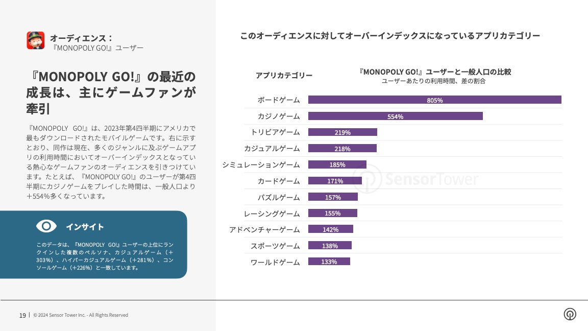 『MONOPOLY GO!』は、第4四半期にアメリカで最もダウンロードされたモバイルゲームです。同作は現在、多くのジャンルに及ぶゲームアプリの利用時間においてオーバーインデックスとなっている熱心なゲームファンのオーディエンスを引きつけています。