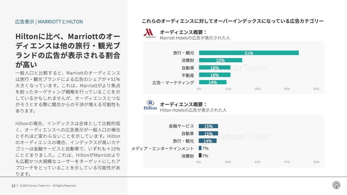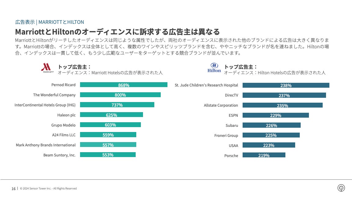 MarriottとHiltonがリーチしたオーディエンスは同じような属性でしたが、両社のオーディエンスに表示された他のブランドによる広告は大きく異なります。