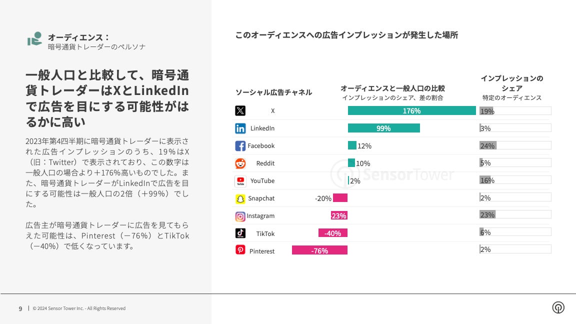 2023年第4四半期に暗号通貨トレーダーに表示された広告インプレッションのうち、19%はX(旧:Twitter)で表示されており、この数字は一般人口の場合より+176%高いものでした。また、暗号通貨トレーダーがLinkedInで広告を目にする可能性は一般人口の2倍(+99%)でした。