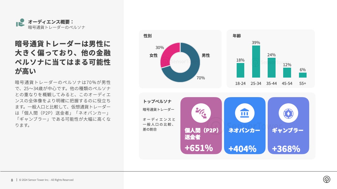 暗号通貨トレーダーのペルソナは70%が男性で、25~34歳が中心です。一般人口と比較して、暗号通貨トレーダーは「個人間(P2P)の支払者」「ネオバンカー」「ギャンブラー」である可能性が大幅に高くなります。