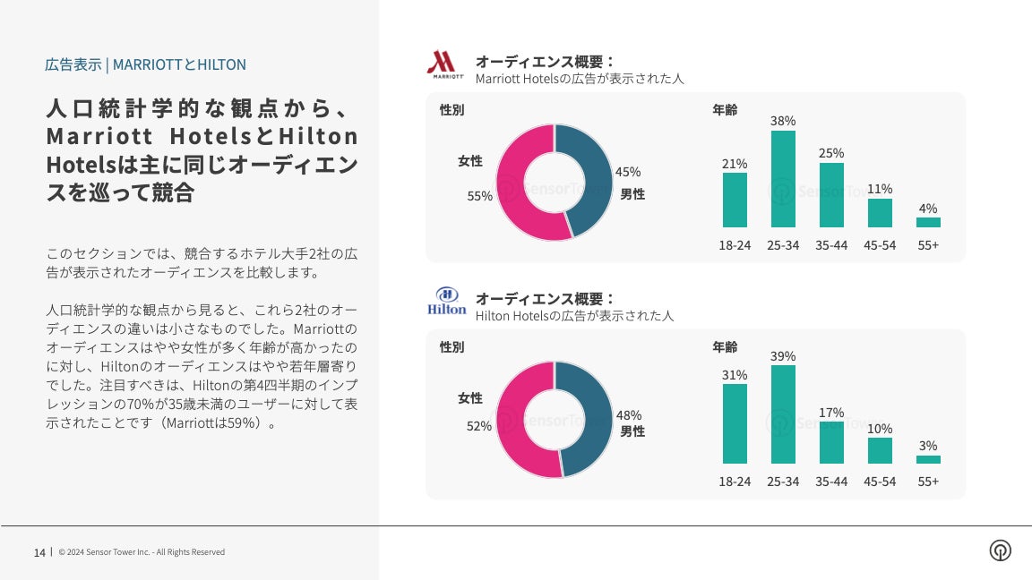人口統計学的な観点から見ると、これら2社のオーディエンスの違いは小さなものでした。Marriottのオーディエンスはやや女性が多く年齢が高かったのに対し、Hiltonのオーディエンスはやや若年層寄りでした。