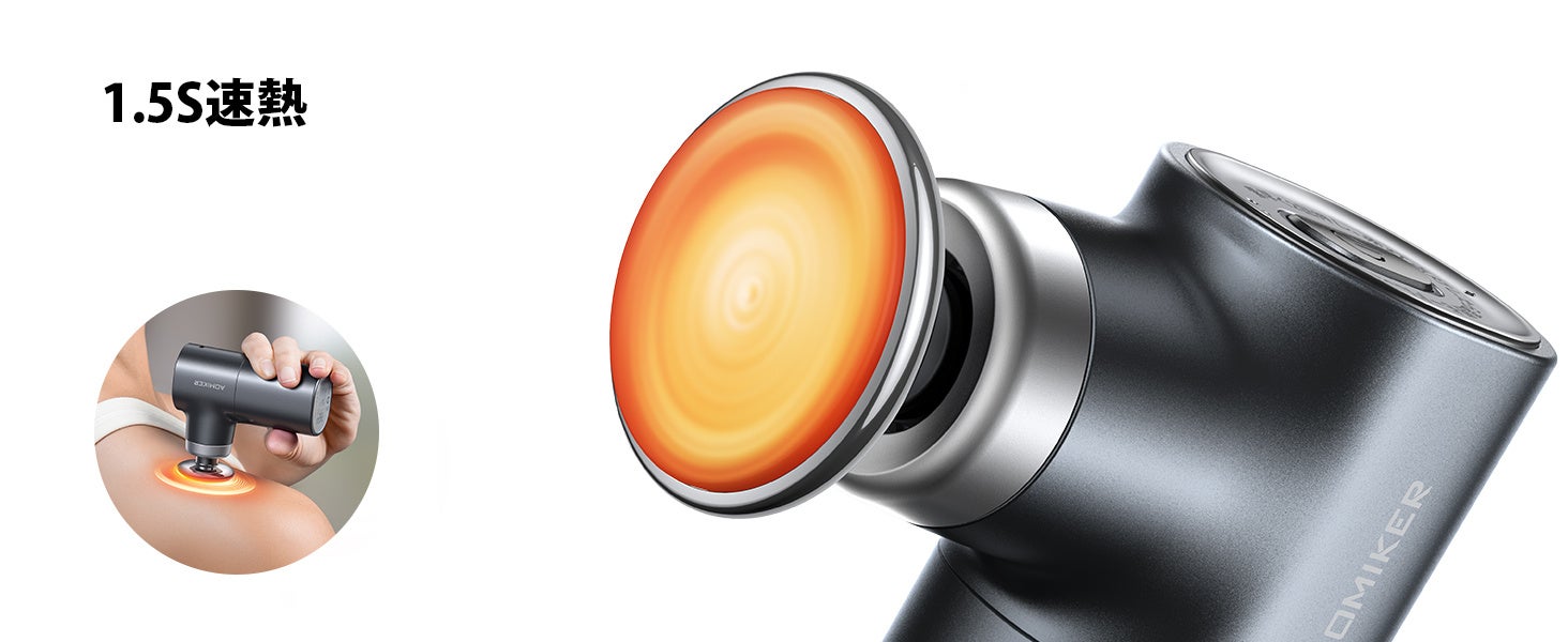 Aomiker健康家電の初試みとして、最新技術を駆使しマッサージガンに温熱機能を搭載いたしました。スイッチで切り替えるだけで、まるで人肌のようなじんわりと温かい温度を実現できます。肩や首のコリを感じたら、すぐに温めて血行を促進することが大切です。温熱機能を使えば寒い冬でも抵抗なく使えますので、より筋膜リリースを習慣化しやすくなります。