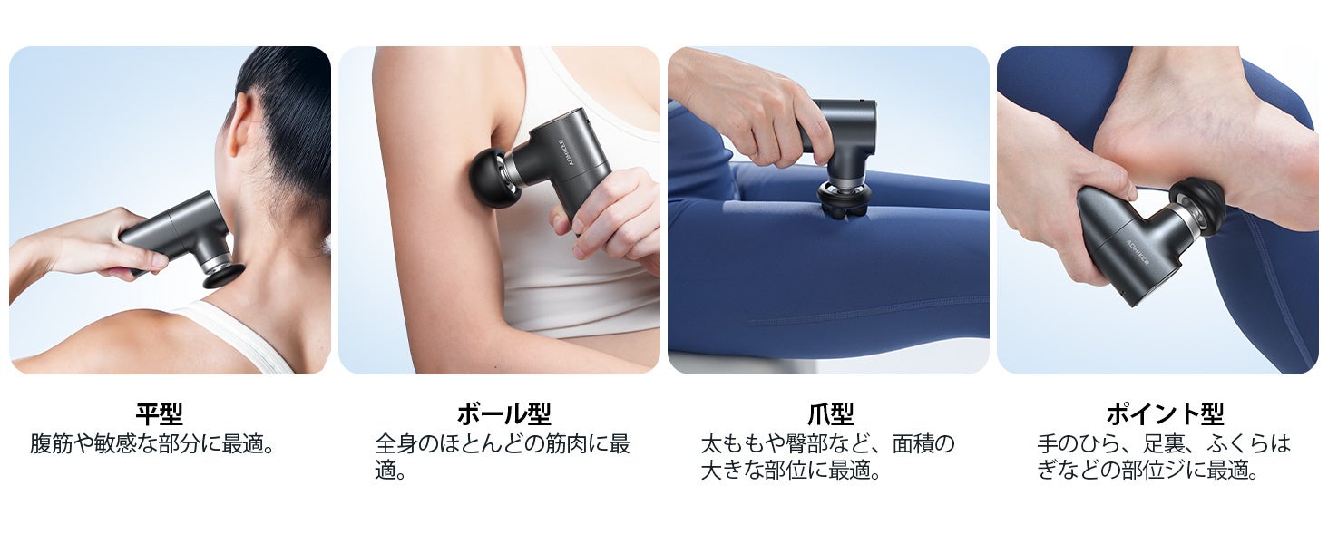 Aomiker独自の検証を重ね、運動習慣の有無によらず最もマッサージ効果が高い振幅と振動数を実現。アタッチメントも4種類同梱されていますので、部位によって使い分けることができます。持ち手が短めでボタンの配置も工夫されているため、片手で簡単に操作ができます。