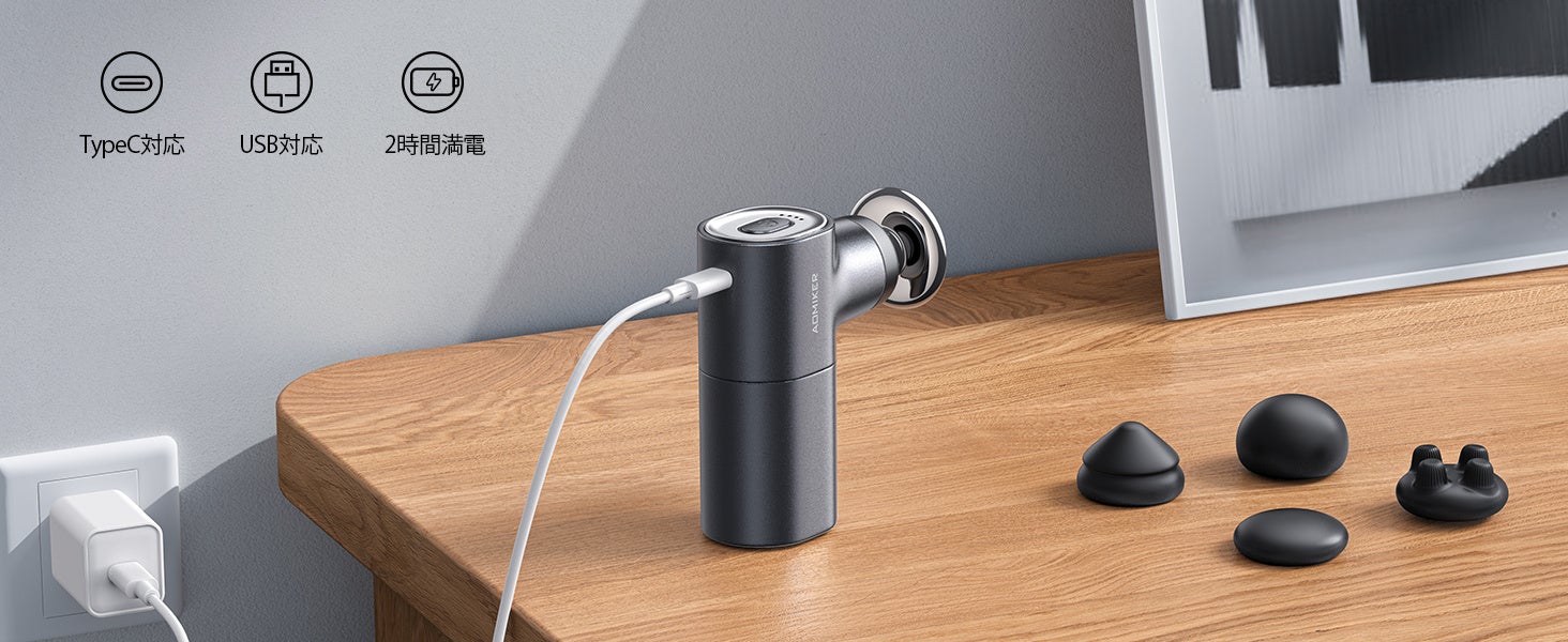 日々の健康に毎日の体のメンテナンスは欠かせません。運動前後のストレッチやケアとして、職場や出張先でのボディケアとして、マッサージガンがあれば疲れを癒していつもよりも気持ち良く日々を過ごせるようになるでしょう。年齢を問わず使用できるマッサージガンはプレゼントにも最適。USBケーブルで充電して使えますので、自宅だけでなく職場や外出先でも気軽に使用できます。