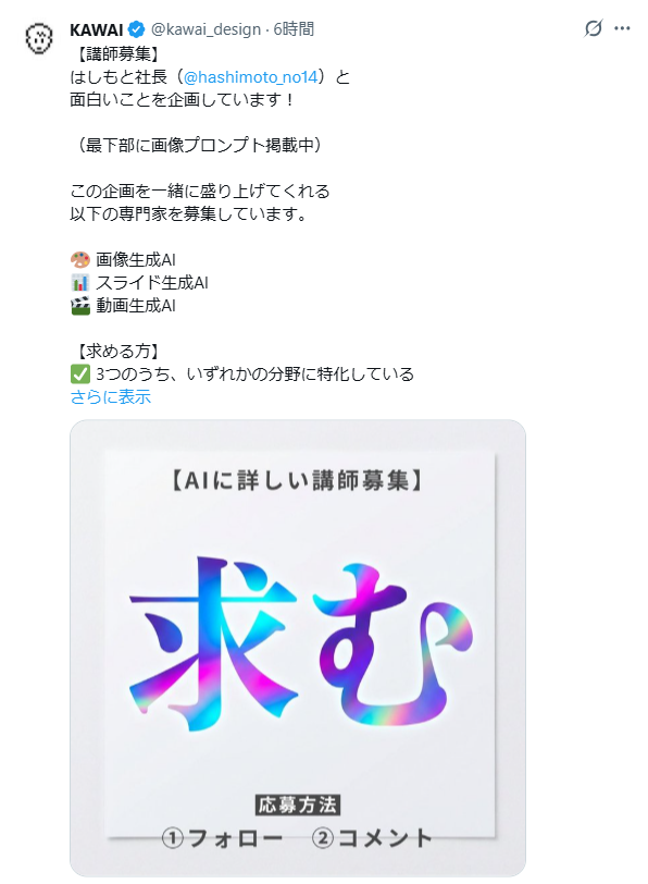 生成AIの急速な進化に伴い、ビジネスやクリエイティブの現場では「どう活用するか」が問われています。しかし、実用的なノウハウを持つ人材はまだ少なく、学びの場も限られているのが現状です。 そこで今回、AIデザイン活用に知見を持つKAWAI(川合卓也)と、AI研修で実績のある株式会社カトルセがタッグを組み、プロジェクトを企画しました。