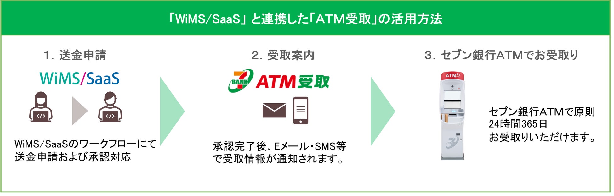 本連携により、経理担当者は従業員から申請のあった経費精算について、「WiMS/SaaS」から送金データをダウンロードし、「ATM受取」の管理画面にアップロードするだけでかんたんに送金登録が可能となります。これにより、急な出張や現金が必要な状況にも、スムーズかつスピーディーに受取りできる環境を提供します。