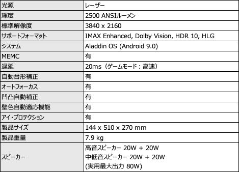「Aladdin Marca Max」では、IMAX Enhanced認証を取得し、圧倒的な高画質を実現しています。また、Dolby Visionで繊細な色彩、シャープなコントラスト、細部までリアリティの高い映像を表現しています。さらに、2500ANSIルーメンの明るさで、日中でも美しくクリアな映像を映し出します。音響面においてもDolby Audioによりクリアな音質を再現し、DTS:Xで立体感のあるサウンドを実現、Harman Kardon製80Wスピーカー(高音スピーカー20W×2、中低音スピーカー20W×2)を搭載し、臨場感溢れる立体音響を提供します。操作性にも優れ、自動台形補正、オートフォーカス、壁色自動調整、凹凸自動補正、スクリーンへの自動アジャストなどの自動機能が備わっております。