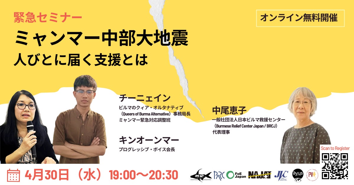 また、日本政府を含む国際社会は、どのようにミャンマー軍による災害支援の武器化を防ぎ、支援を必要としている人びとにそれを確実に届けるために行動できるのかにつき、ミャンマーの市民グループからの提言を伺います。