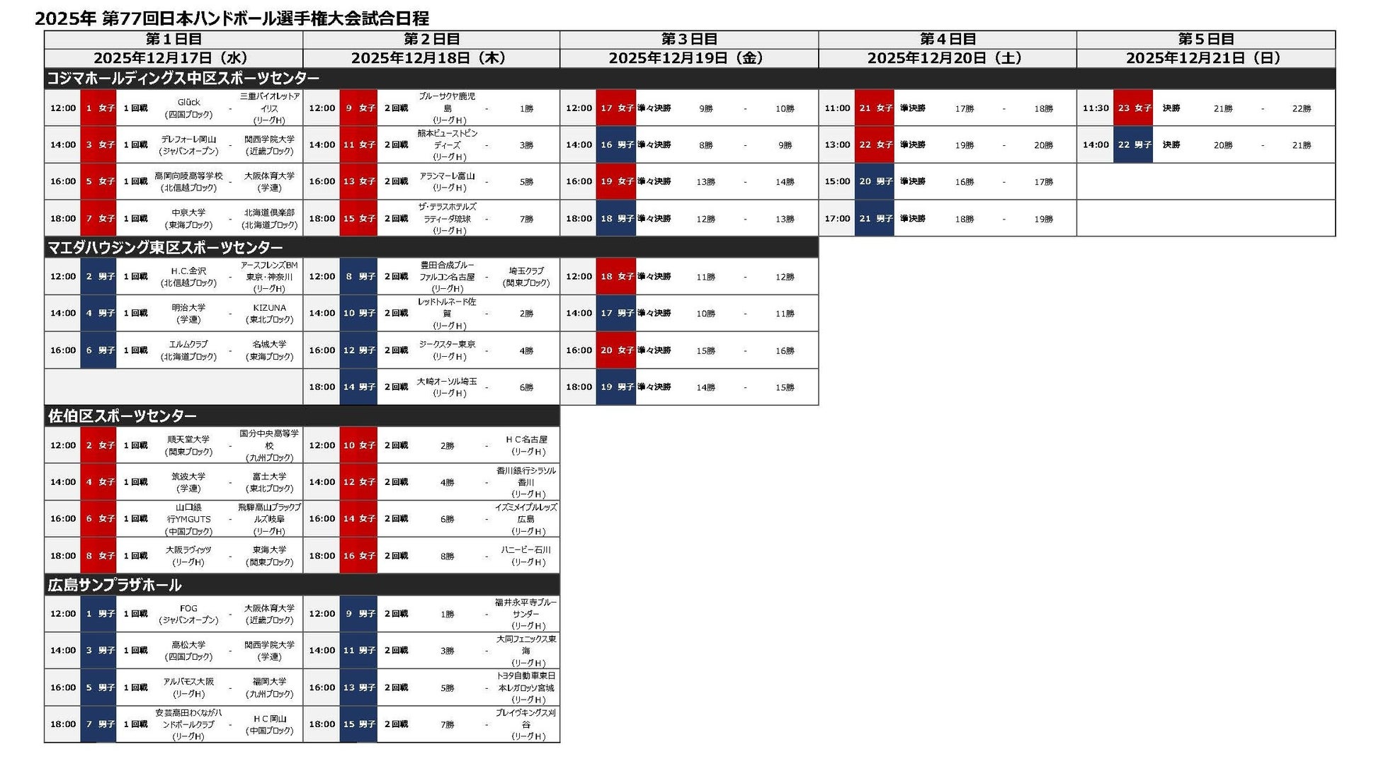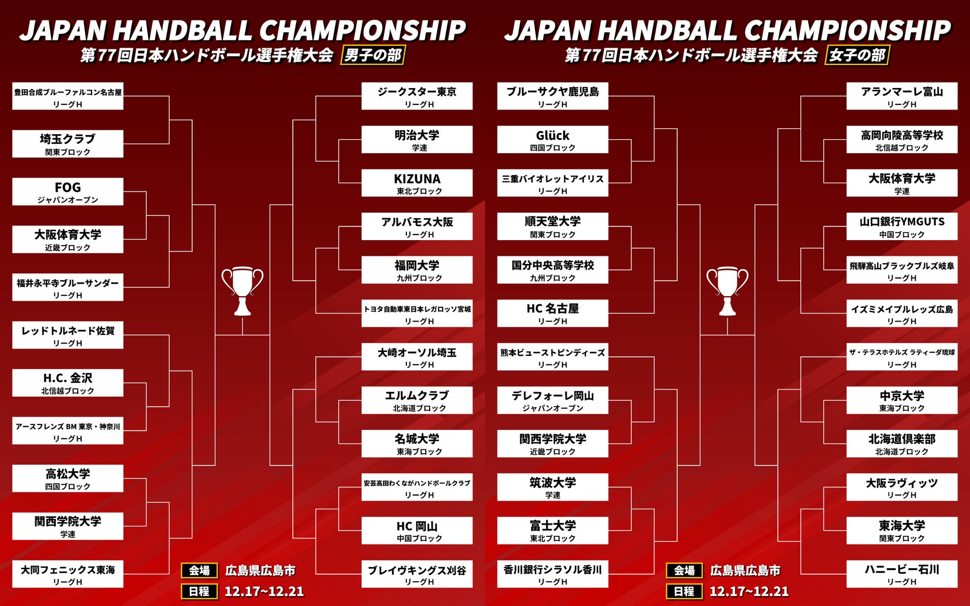 日本ハンドボール界の年末の風物詩、高校・大学・社会人・リーグHのチームがカテゴリーの壁を超えて日本一の座を争う第77回日本ハンドボール選手権大会(12月17~21日、広島県広島市)の組み合わせが11月17日に決定しました(下表)。
