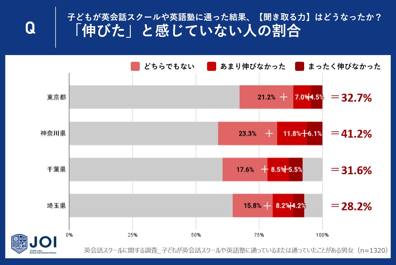 「リスニング力」が伸びたと感じていない人の割合において、神奈川県は41.2%と4つの都県中で最も高い数字を示しています。