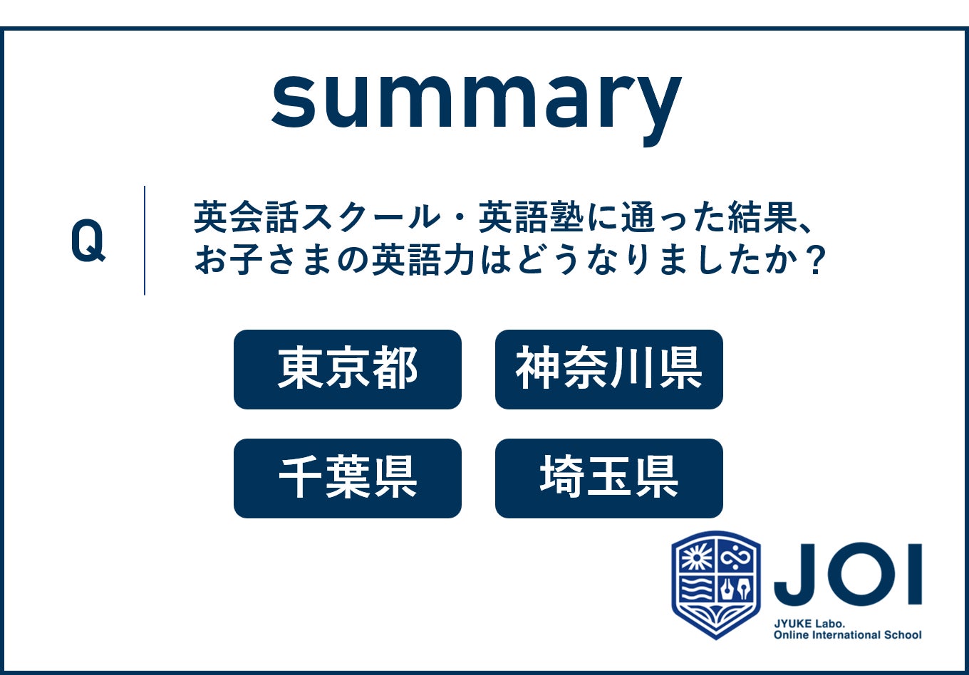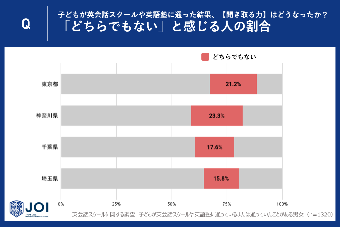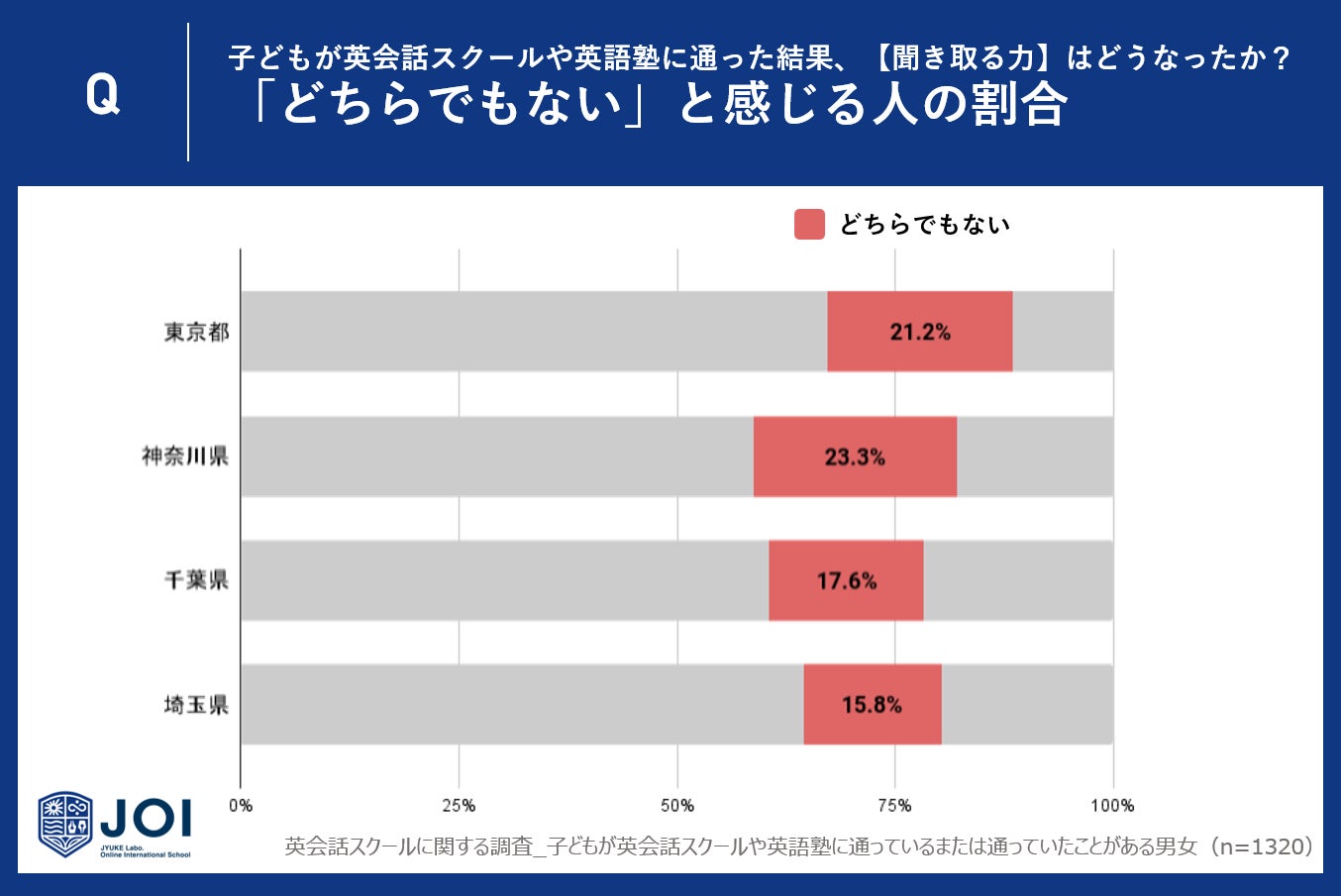 東京都、神奈川県、千葉県、埼玉県の一都三県で子供を英会話スクール、英語教室や塾に通わせている、または通わせたことがある親に「英語を聞き取る力(リスニング力)」に関する成果をアンケートしたところ、成果の実感に地域差が見受けられました。
