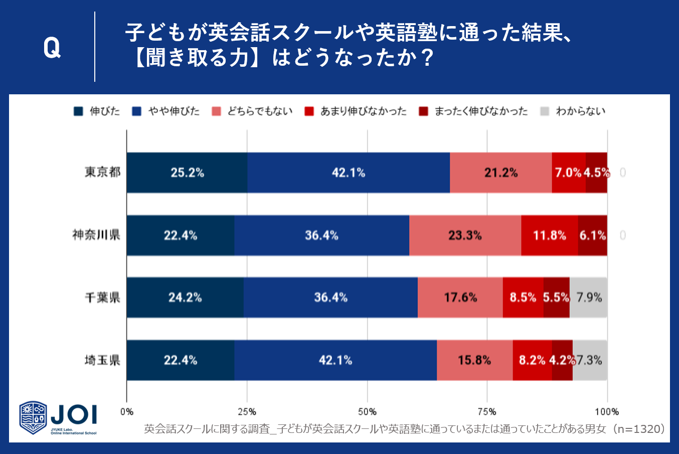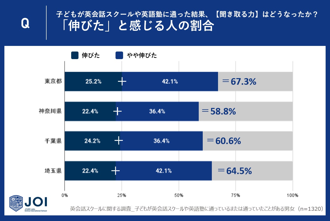 東京都は約7割の親が子供の英語リスニング力の伸びを実感。一番満足度の低い神奈川県でも約6割の親が伸びを実感という好結果