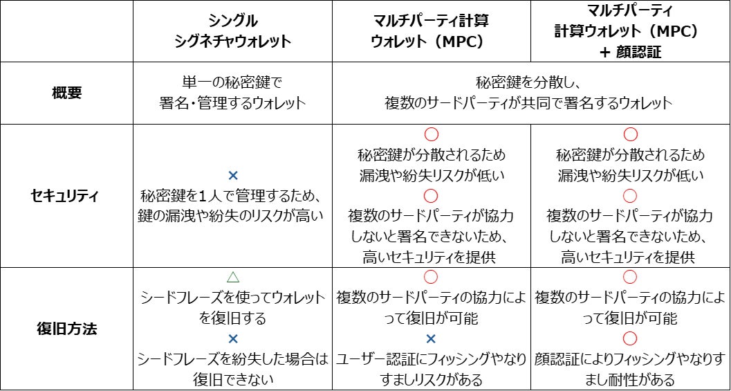<ノンカストディアルウォレットにおける他の復元方法との比較>