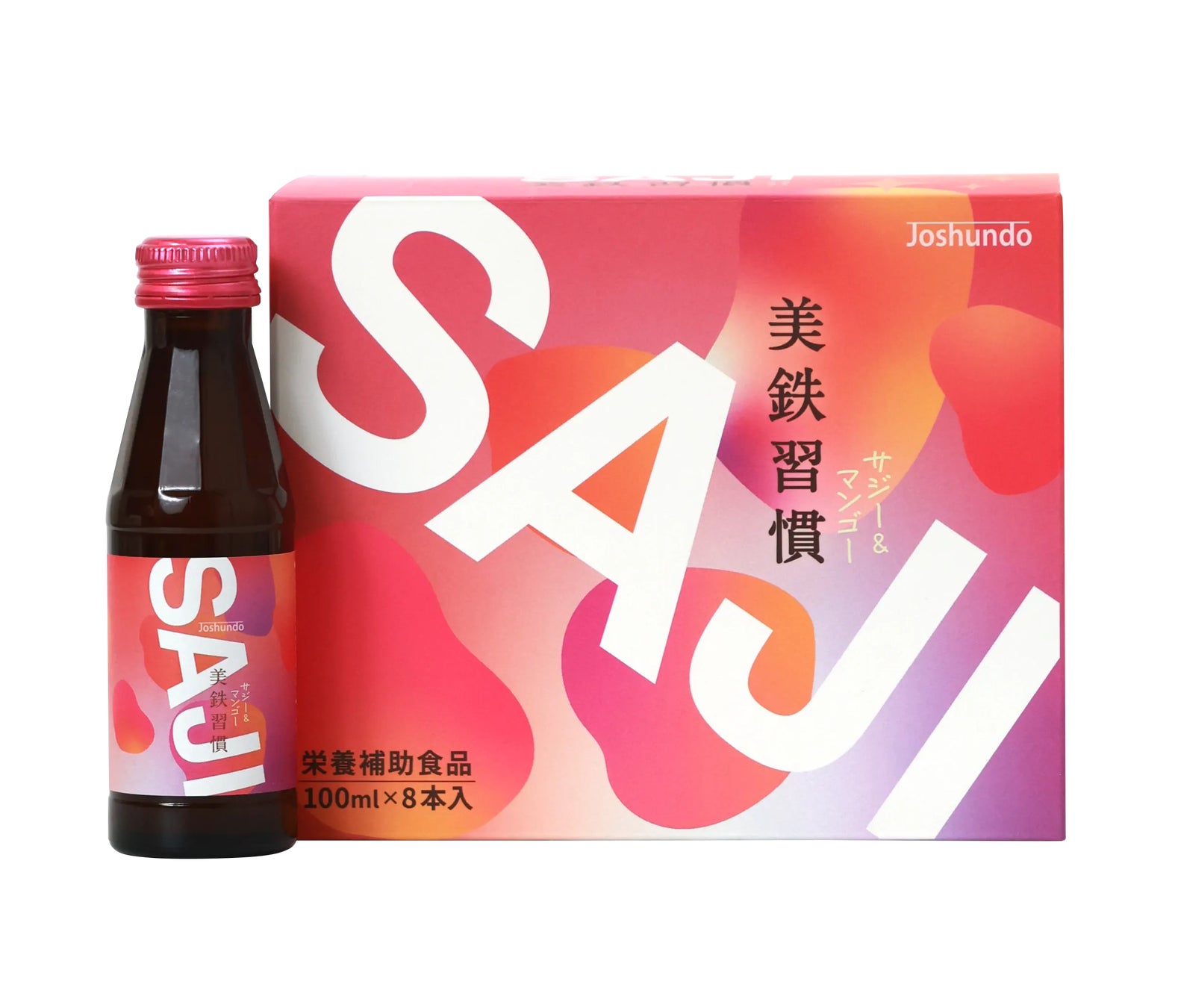 有機JAS認定サジーにマンゴーをブレンドした「SAJI美鉄習慣」は、爽やかな味わいが特徴の100ml飲み切りタイプのドリンクです。サジーの酸味にマンゴーのやさしい甘みを加えることで、フルーティーで飲みやすく、毎日のリフレッシュや手軽な栄養補給におすすめです。