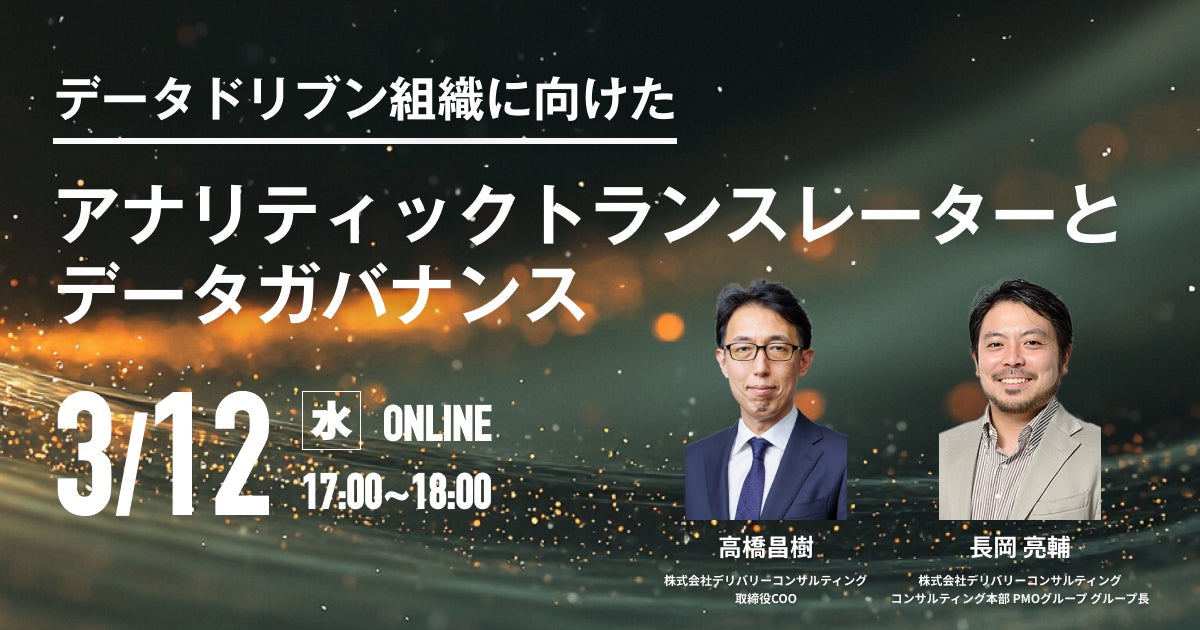 データリテラシーの向上を通じてデータドリブンカンパニーへの変革を支援する株式会社デリバリーコンサルティング(本社:東京都港区、取締役CEO:内藤 秀治郎)は、データドリブンな組織を実現するために不可欠なアナリティックトランスレーターが担うべき役割とデータガバナンスをテーマとしたWEBセミナーを開催いたします。