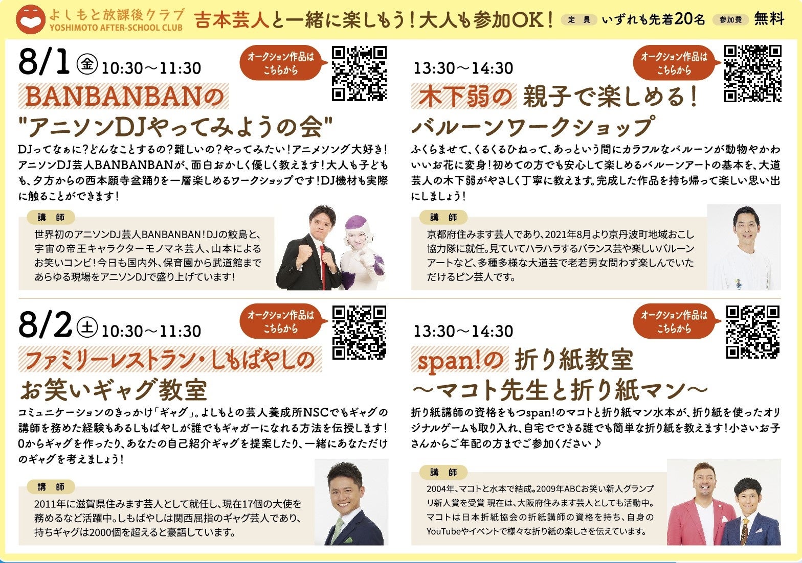 吉本興業に所属する芸人と一緒に、大人も子どもも一緒に楽しめるワークショップを開催します。