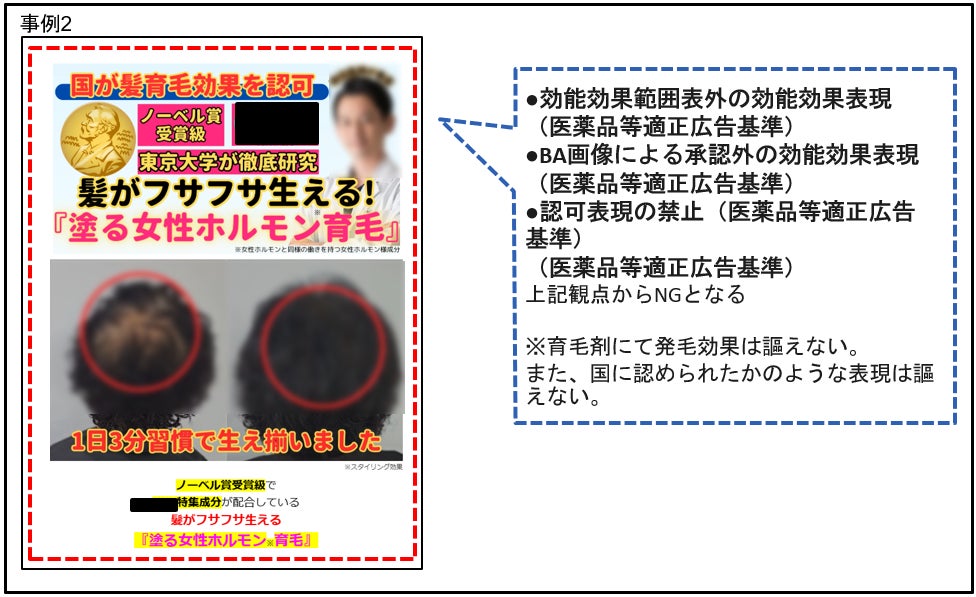 例6:育毛剤において、塗る植毛、誰にもバレずに生やせる、などの表現や、BA画像により、あたかも髪が生えるかのような表現。また白髪が生えてこなくなる、白髪ケア、などの白髪に効果があるかのような表現。