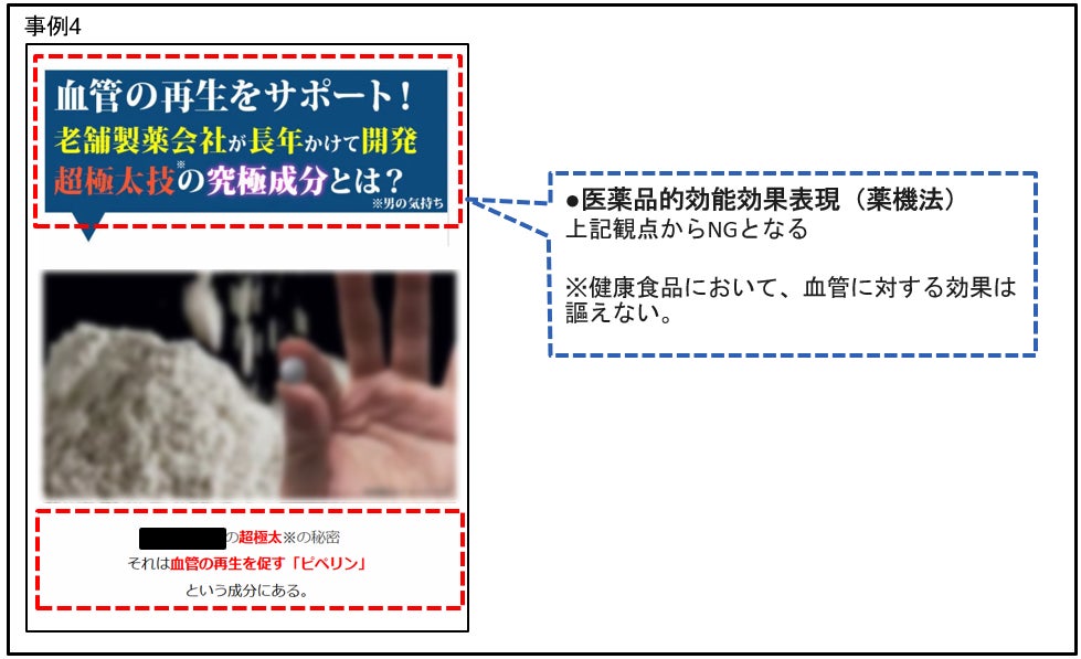 例:目のコントラスト感度を改善する機能に対して眼鏡が必要なくなるかのような訴求表現、BA画像や対比画像などを用いて視力が改善されると誤認させるような表現、脂肪便や代謝を高める機能、あたかも体質改善がなされてリバウンドしないと誤認させるような表現、「永久に歩ける」及び、杖なしでスムーズに歩けるようになったBA画像等、歩行能力が維持ないし向上できる程度を誤認させる、過度な表現