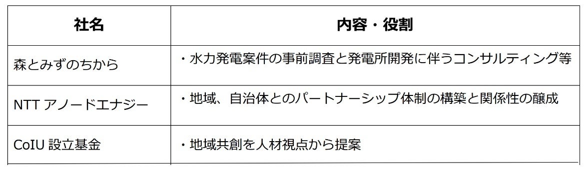 全国で水力発電事業を手がける株式会社森とみずのちから(代表取締役:貝本隆三、本社、奈良県吉野郡下市町、以下「森とみずのちから」)は、エネルギー流通ビジネスを展開するNTTアノードエナジー株式会社(代表取締役社長:岸本 照之、東京都港区、以下「NTTアノードエナジー」)および共創を軸にした新しい大学設立に取り組む一般社団法人 CoIU設立基金(代表理事:井上博成、岐阜県飛騨市、以下「CoIU設立基金」)と、国内の豊富な水資源を生かした小水力発電事業および地域共創事業の検討のための協定を締結しました。