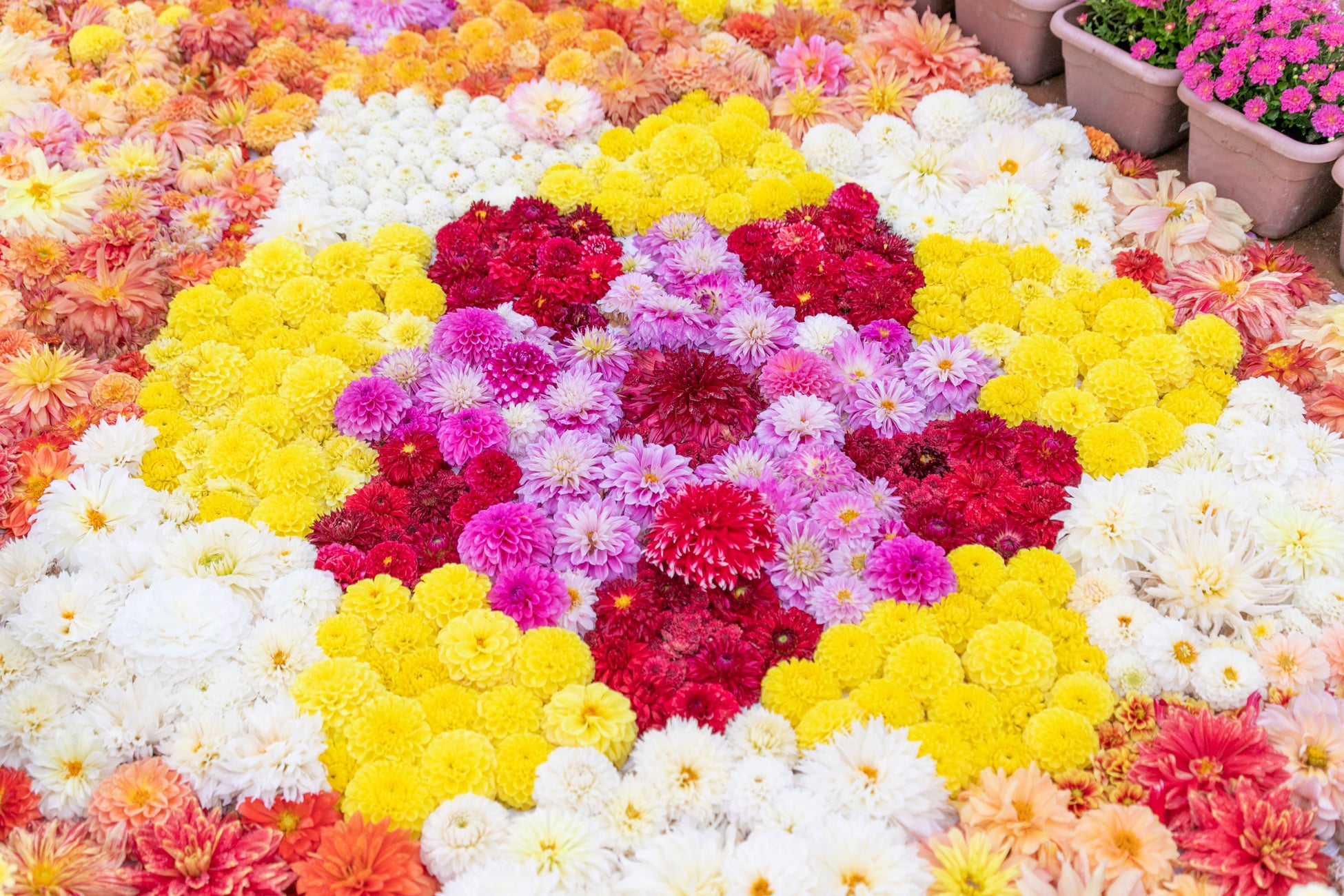 ダリアの生花を敷き詰めて模様をつくる花絵は毎年人気の展示です。今年のデザインをお楽しみに。