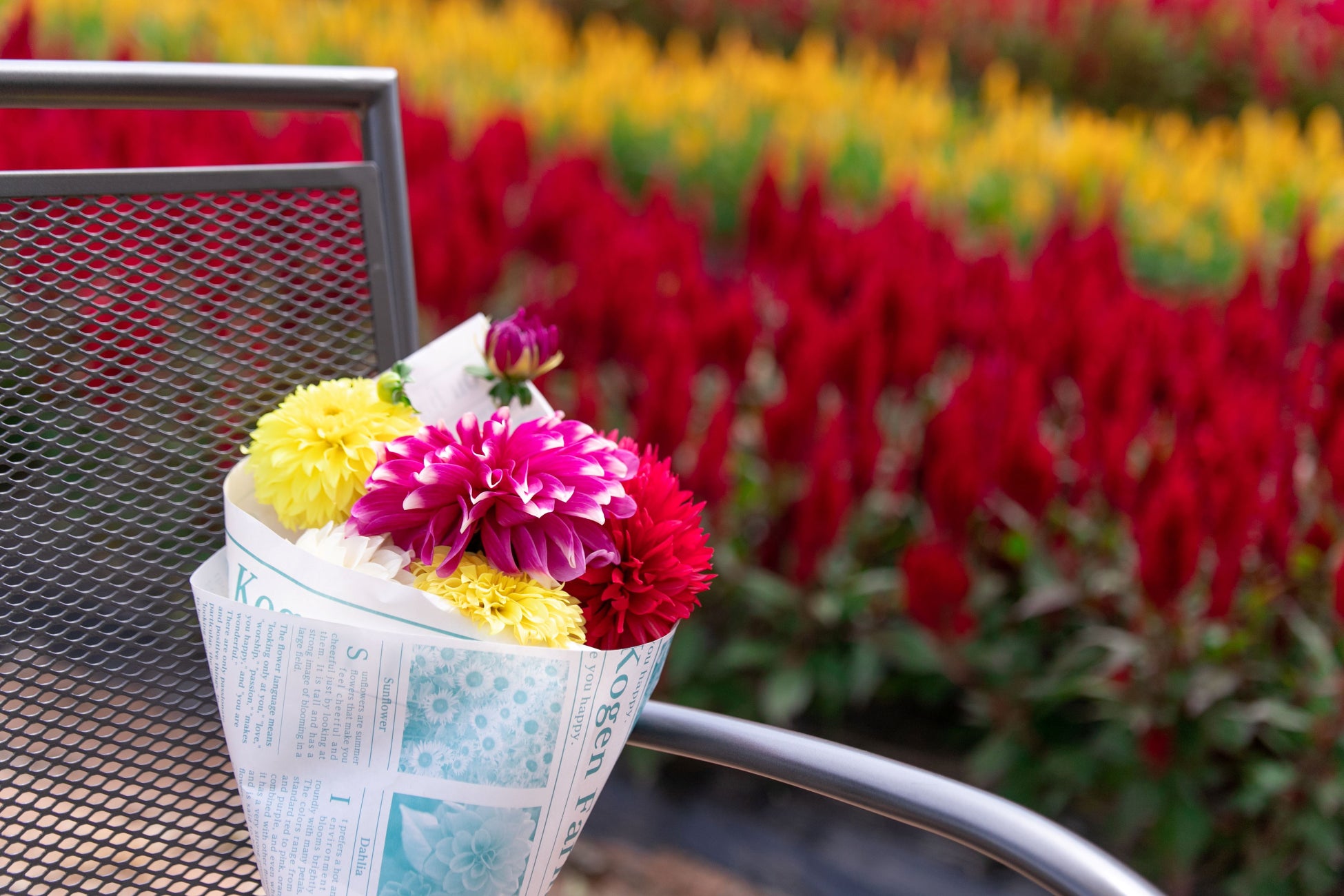 ダリア、ガーデンマム、秋の花々を展示するフォトスポットです。記念撮影におすすめです。
