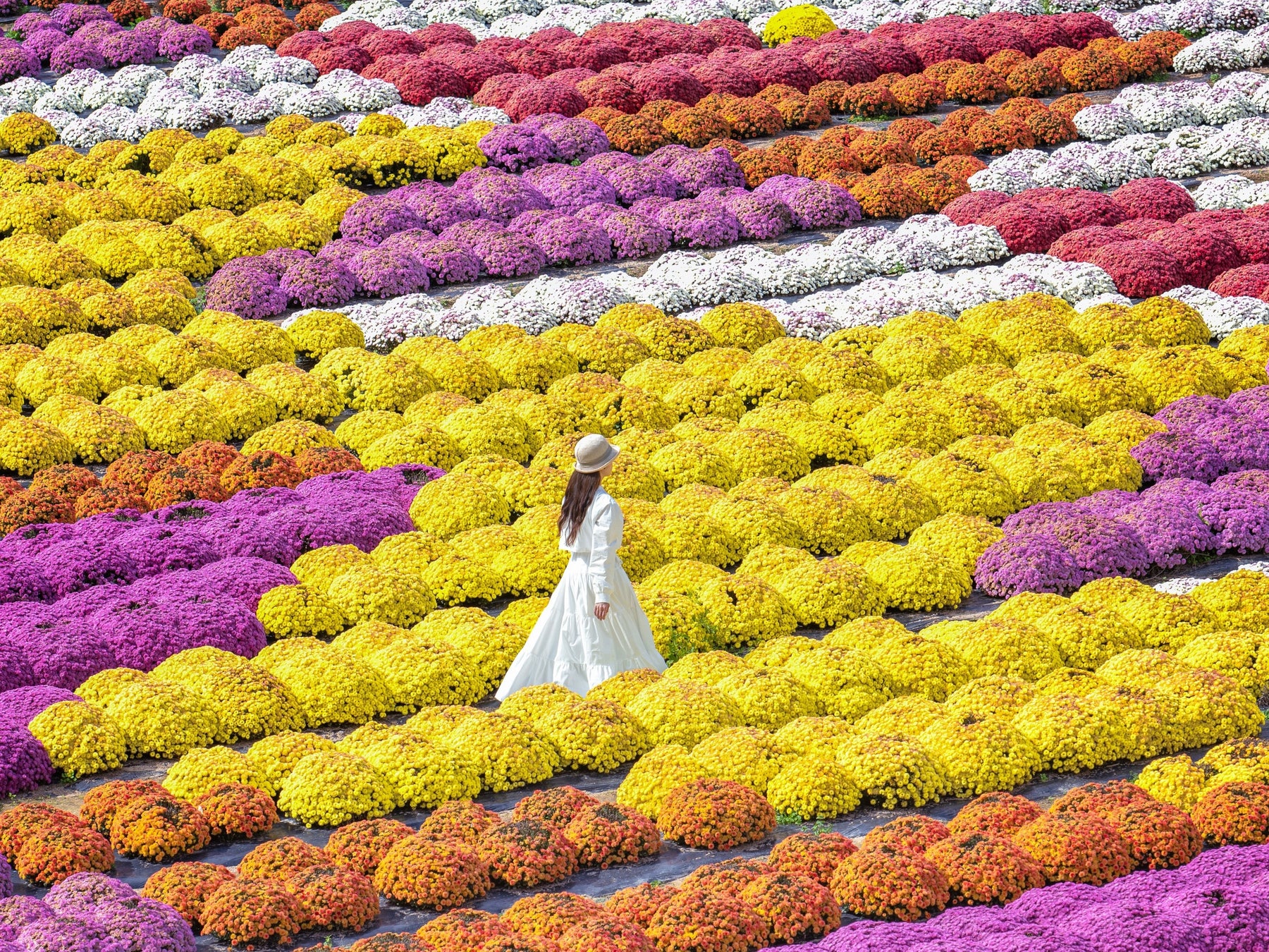 極彩色のガーデンマムが畑に一面に咲き広がり、絵にかいたような美しい風景を造りだします。新しく増設した通路からも見わたせるようにしています。今年は放射線のように広がる模様に植栽していますので、その直線美をお楽しみください。