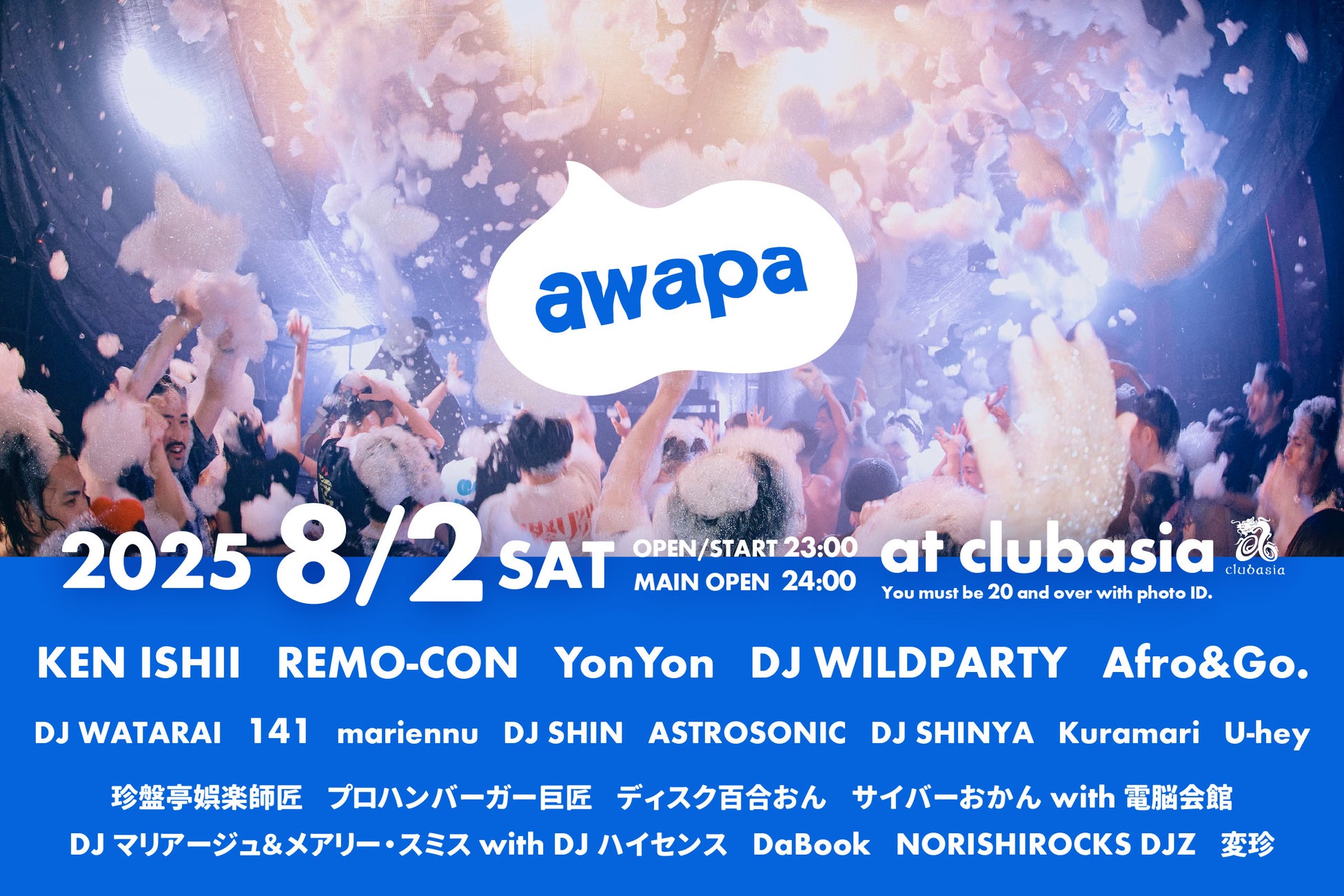 イキすぎた愛と混沌のフードフェス「脳汁横丁」や120万枚の花びらに埋もれるチルアウトバー「SAKURA CHILL BAR by 佐賀」など、話題の体験型イベントを多数手がけるクリエイター「アフロマンス」と、クリエイティブカンパニー「Afro&Co.」は、 2025年8月2日(土)に渋谷clubasiaで開催する、泡にまみれる体験型イベント、泡パーティーこと「泡パ®︎」の出演ラインナップを公開いたします。