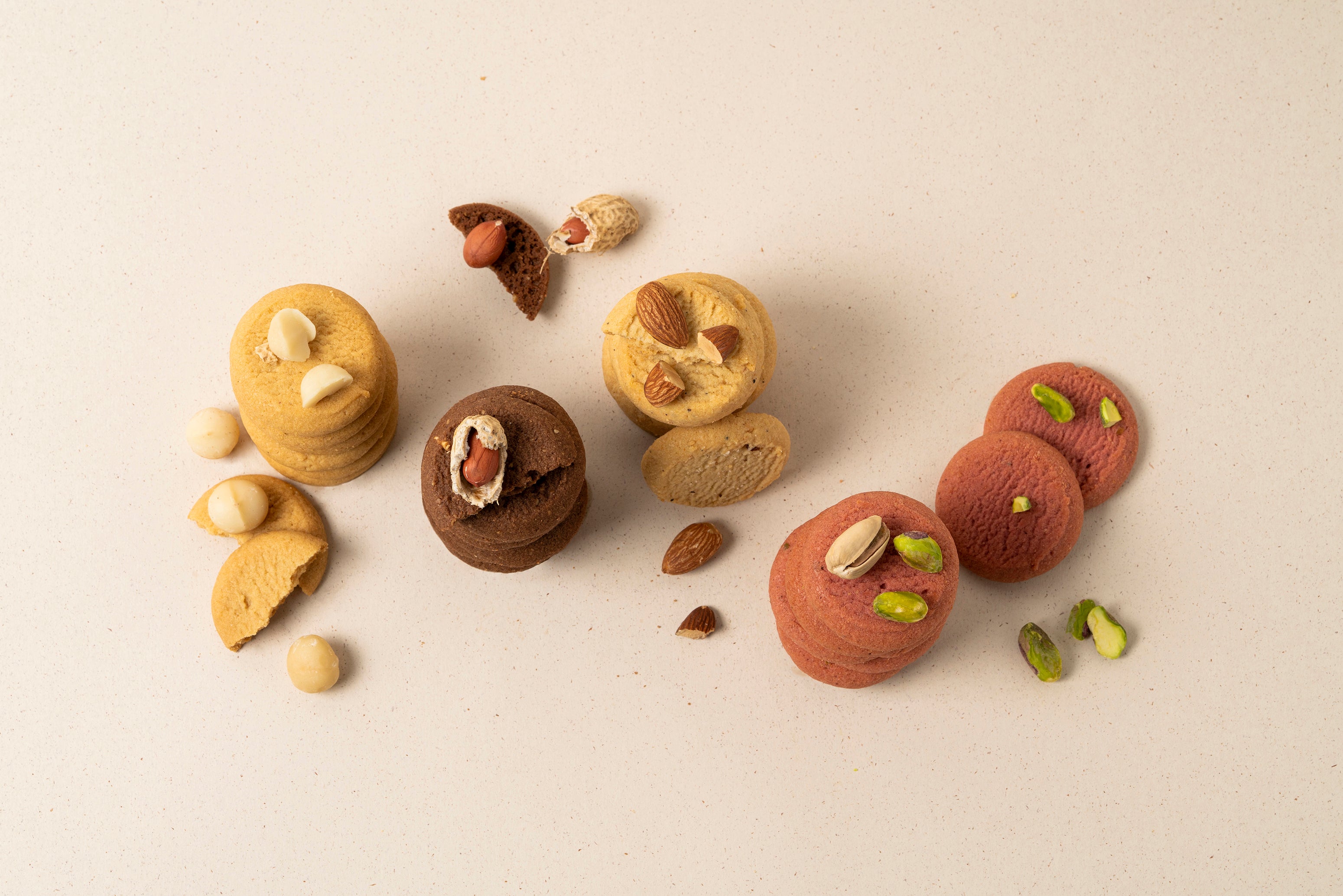 マカダミアバニラ、フランボワーズピスタチオ、ピーナッツショコラ、チーズ黒胡椒アーモンドの