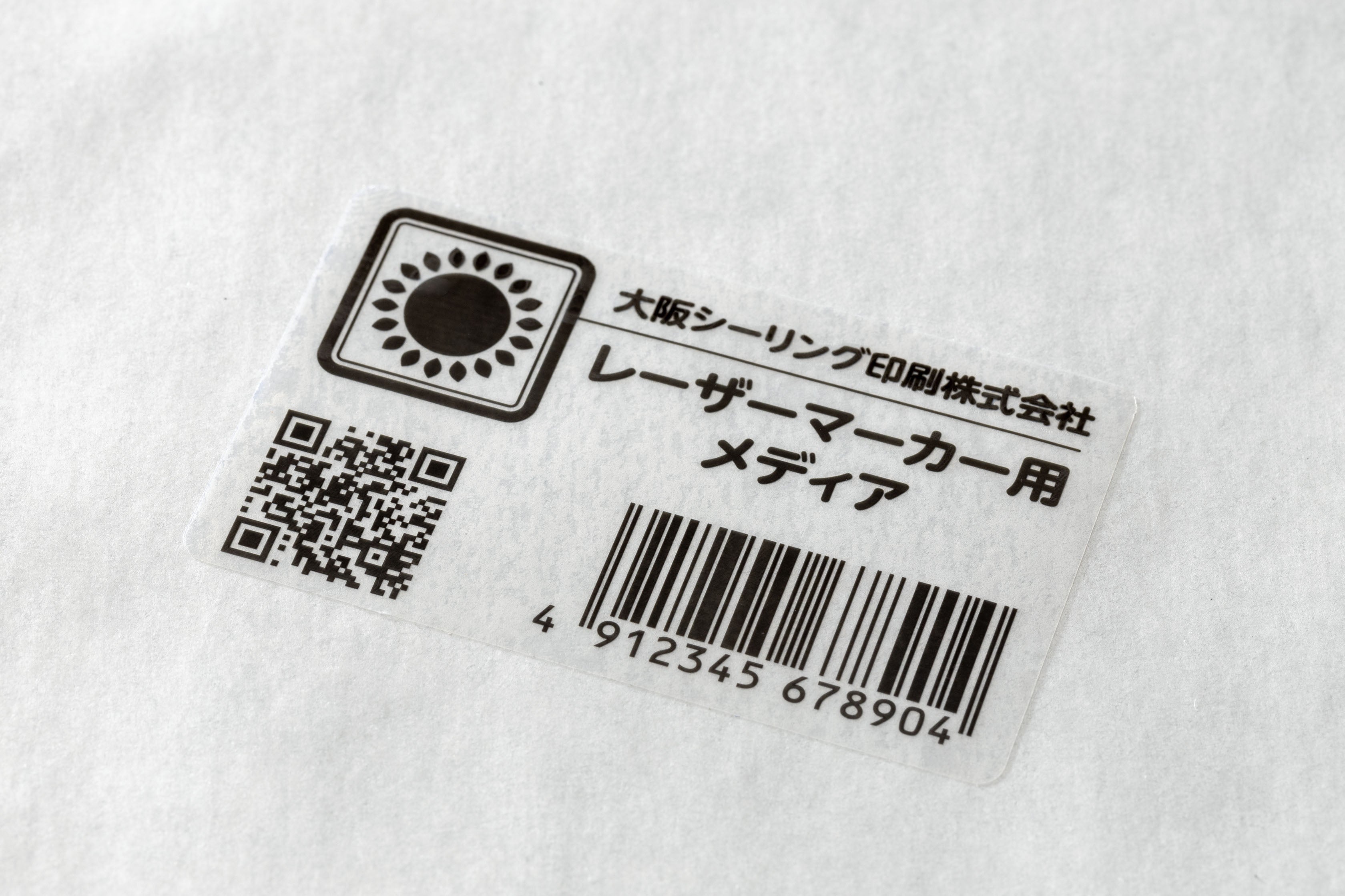 大阪シーリング印刷が2014年に発売した「クリアサーマルフィルム(以下、参照ください)」の塗工技術や軟包材加工のラミネート技術を活かし、使用する接着剤・粘着剤と発色剤の組み合わせを最適化することで成功に至りました。本製品は多層構造になっており、UVレーザーを照射する最表層に発色層がないため、クリアな印字仕上がりでこすっても消えにくく水や油に強いことが特長です。また、和紙風のレーヨンやマットフィルムなどの表面に凹凸のあるメディアにも、きれいに印字することができます。さらに、インキや印刷版、またインクリボンも不使用のため印字の際に発生する消耗品がありません。