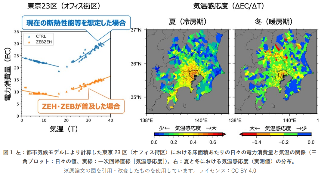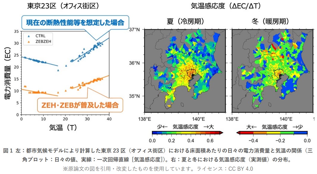 しかし、電力消費ビッグデータからはZEH・ZEBが普及していない現在の状況での気温感応度しか得られません。そこで、産総研が独自開発した都市気候モデルを応用し、ZEH・ZEB普及時の気温感応度の推計を行いました。具体的には、都市気候モデルで現在の断熱条件などで観測された気温感応度を再現し(図1左、青色)、その後、モデルの中でZEH・ZEBが普及した条件での気温感応度を計算しました(図1左、オレンジ色)。その結果、ZEH・ZEBの普及により、気温感応度が約半分になると推定されました(図1左)。