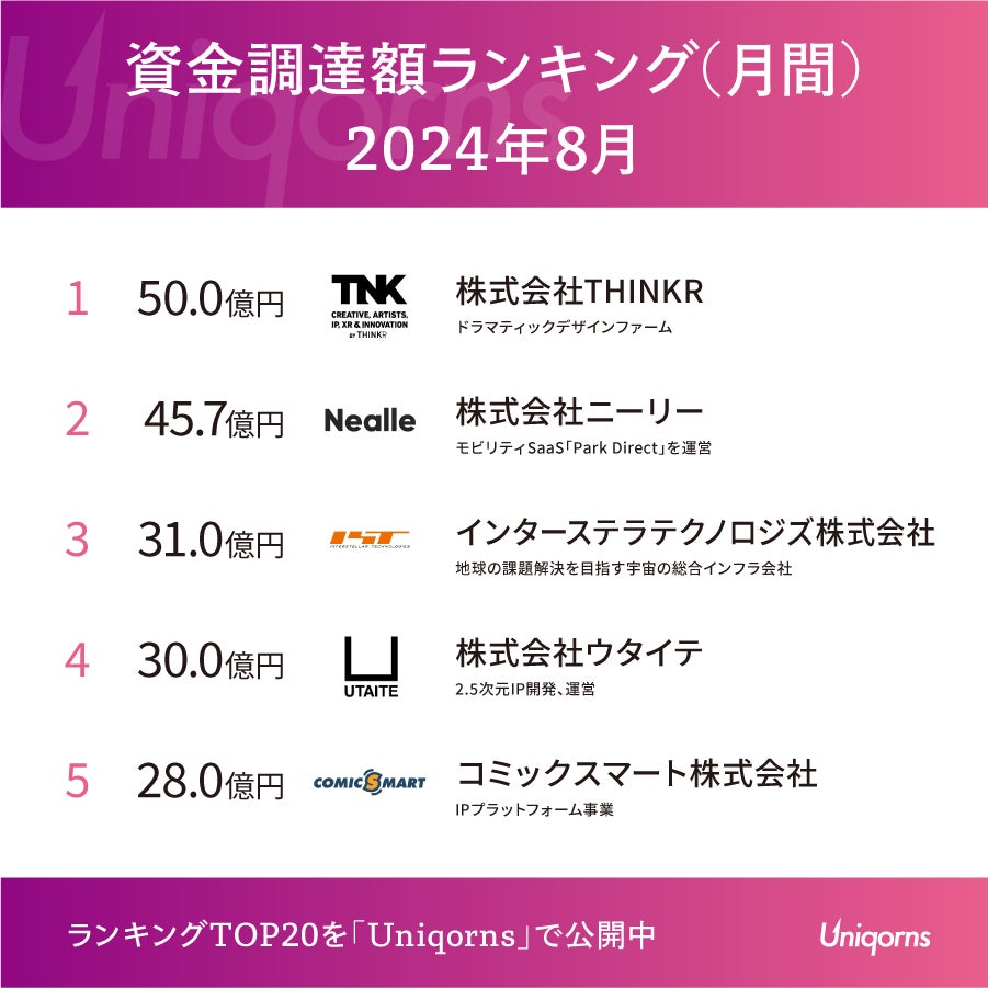 国内最大級のスタートアップメディア「Uniqorns(ユニコーンズ)」が2024年8月のスタートアップ資金調達状況をランキング形式で発表