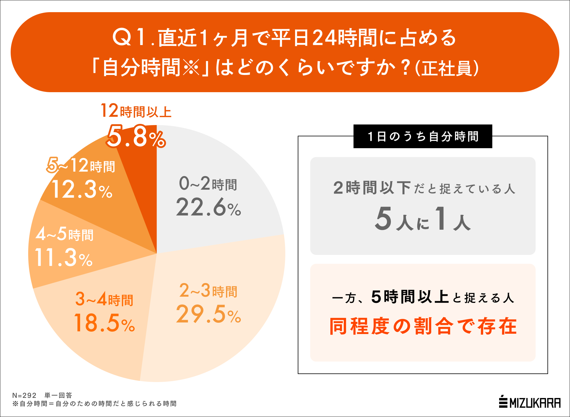 調査の結果、だいたい同じ時間を拘束される「正社員」に絞って回答を見ても「自分時間」の量は人によって大きく異なることがわかりました。5人に1人は1日のうち自分時間は2時間以下だと捉えている一方、「5時間以上」と捉える人も同程度の割合で存在します。