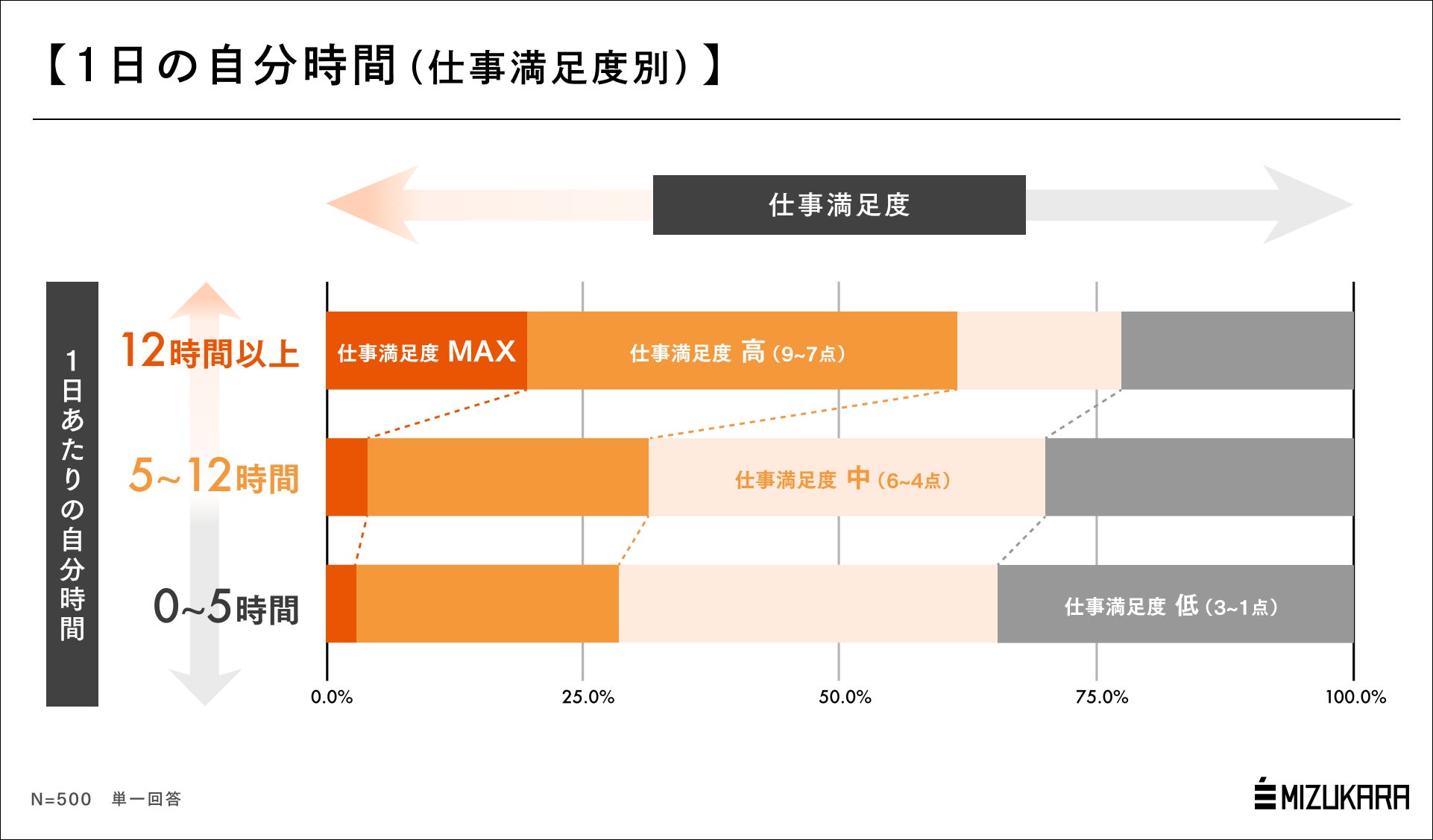 認知科学に基づくコーチングを法人・個人に提供する株式会社ミズカラ(本社:東京都千代田区、代表取締役 山宮健太朗)は、2026年2月10日(火)に20歳~59歳の有職男女500名を対象とした「自分時間の量と仕事満足度の相関」調査を行いました。