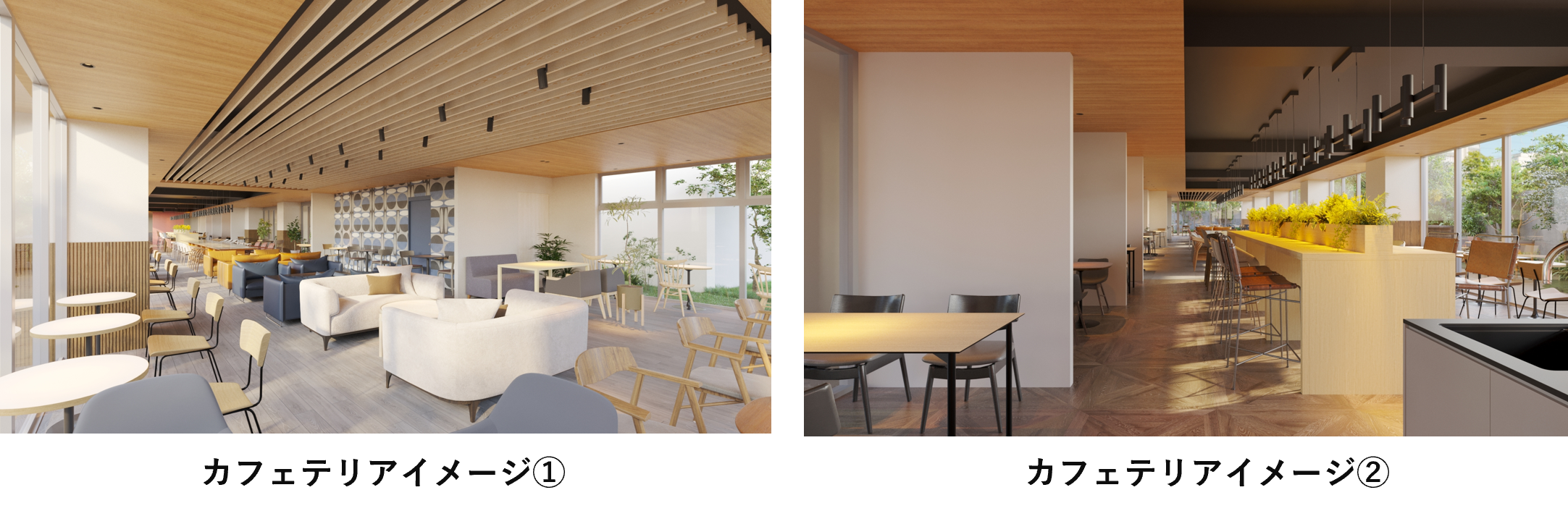 カフェテリアには、カウンター席や、窓の外を眺めながら利用できる一人用のハイスツール席、開放感のある屋外テラスを設置し、多様なシーンに対応しています。
