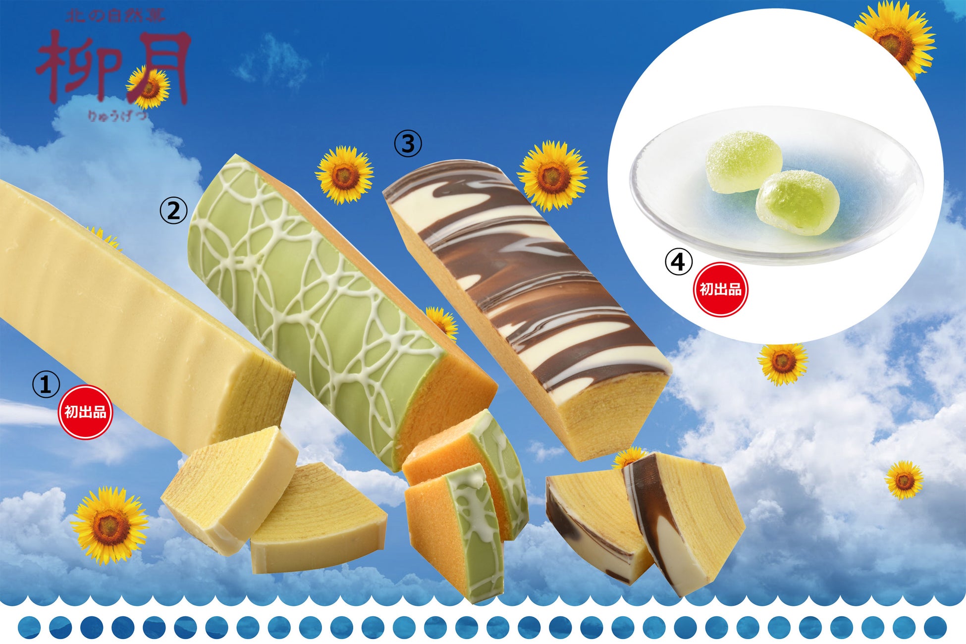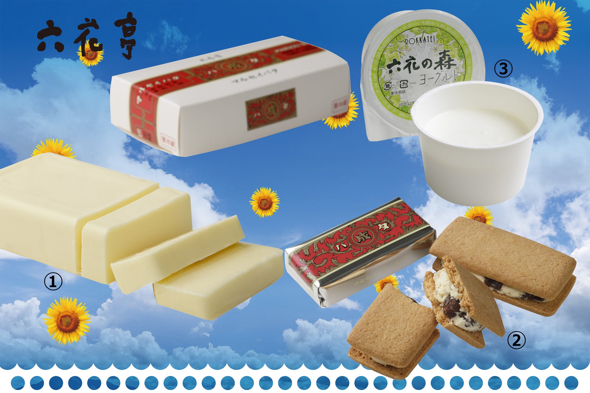 ①三方六 しおバター(1本)750円、②三方六 めろん(1本)750円、③三方六(1本)700円、④涼丸(1個)各130円