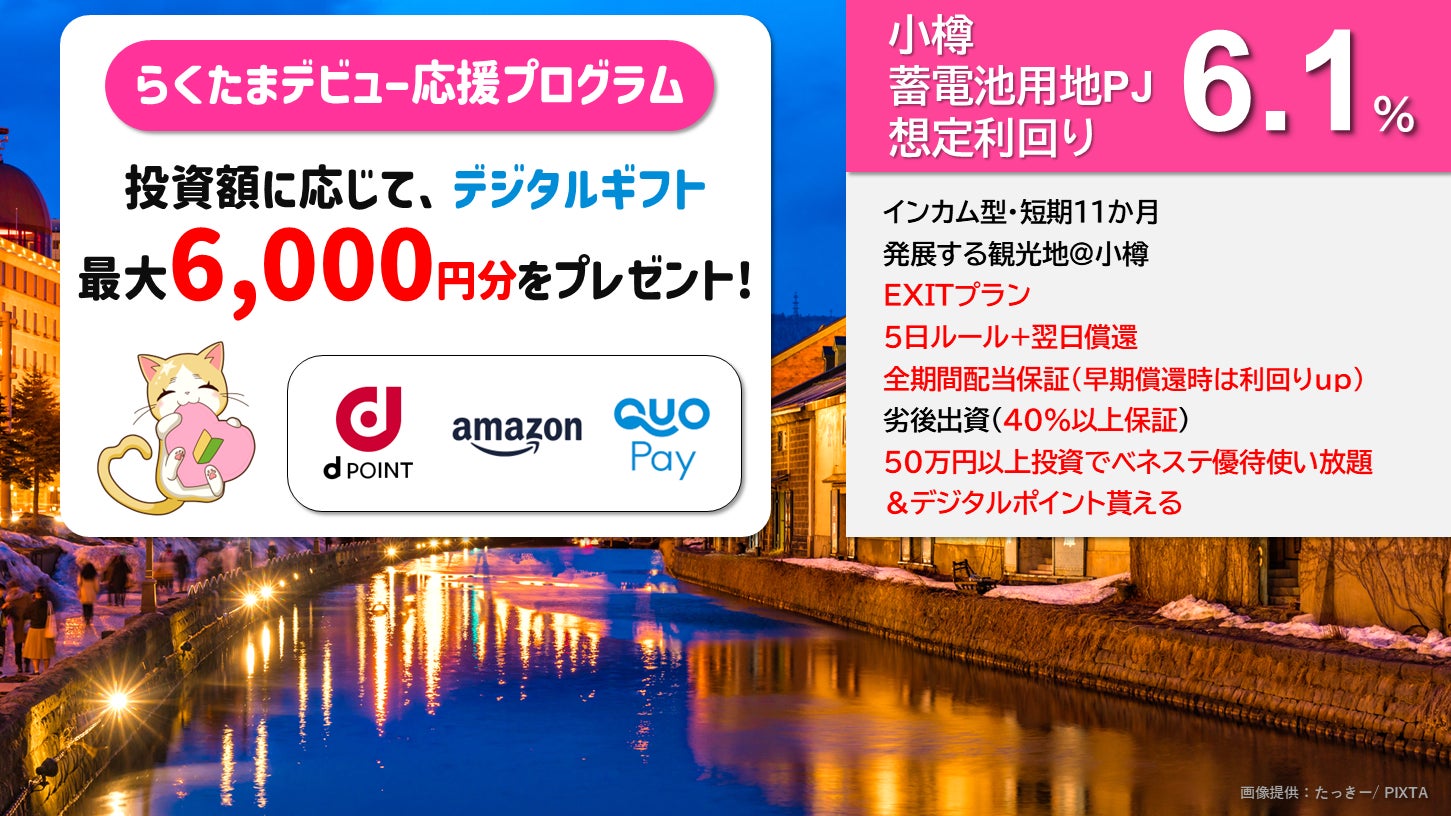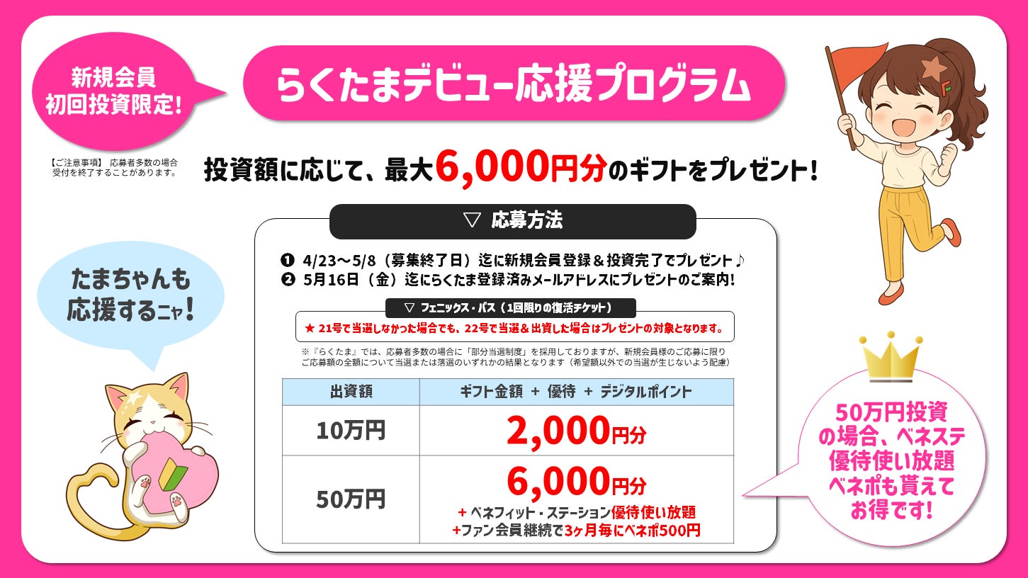 【らくたまデビュー応援プログラム】らくたま21号限定!初回投資をすると投資額に応じて最大6,000円のデジタルギフトがもらえる!
