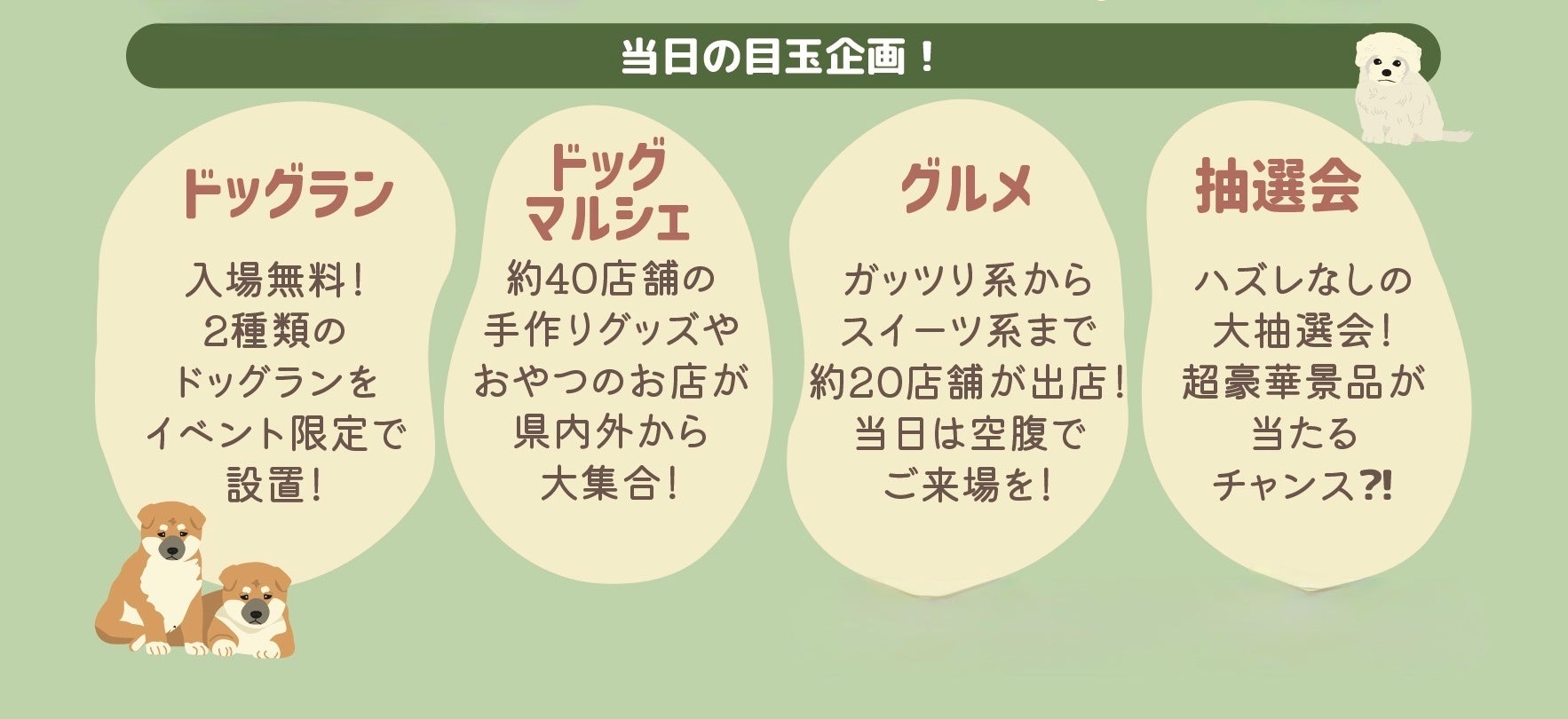 クリスマスシーズンのドッグフェスということで、当日は季節感あふれる演出が用意されます。会場内には2種類の「ドッグラン」を設置し、当日限定でお楽しみいただけます。その他、兵庫県内外から約40店舗が出店する「ドッグマルシェ」、約20店舗が出店する「グルメブース」、「犬種別オフ会」、飼い主と愛犬が一緒に走る「ドッグレース」や先着500名で必ずなにか当たる「抽選会」など、多彩な企画が用意されます。