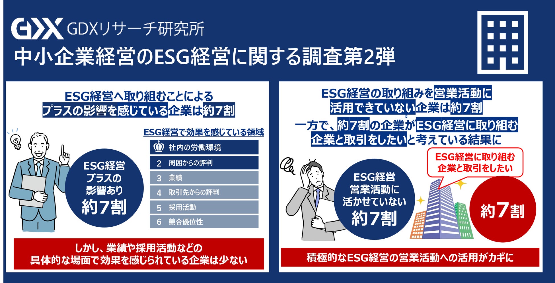 〈中小企業のESG経営に関する実態調査 2弾〉ESG経営へ取り組むことにプラスの影響を感じている企業は約7割 しかし実際はESG経営を営業活動に活用できていない企業が大多数