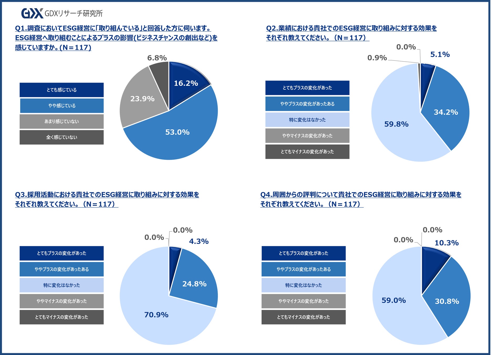 ESG経営へ取り組むことによるプラスの影響(ビジネスチャンスの創出など)を「とても感じている」という回答は16.2%、「やや感じている」と回答は53.0%とプラスの影響を感じている企業は全体の約7割ということが分かりました。