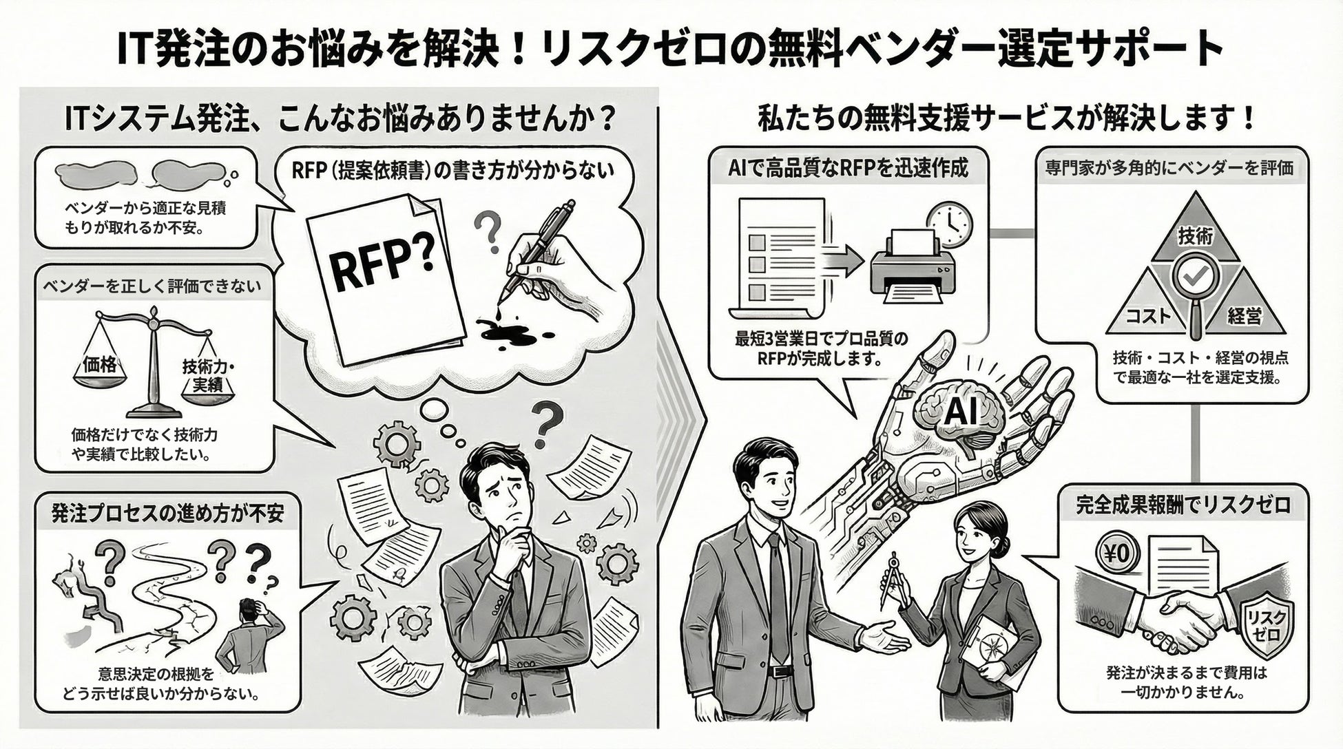 IT発注の3大課題を完全無料で解決、成果報酬型「RFP作成&ベンダー選定支援」開始