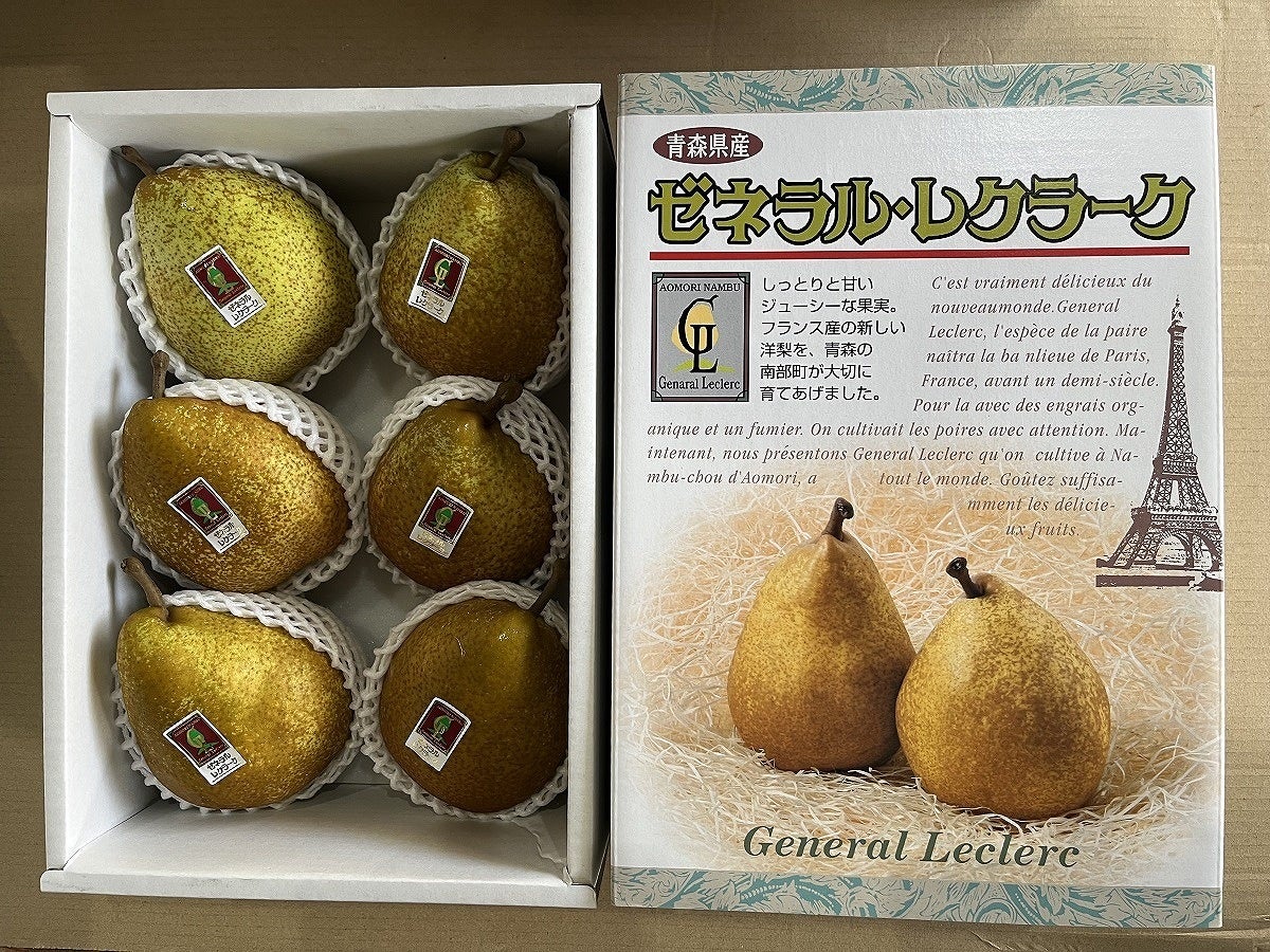 ゼネラル・レクラークは、青森県の南東部に位置し、四季折々のフルーツの栽培が盛んな南部町で、日本一の生産量を誇る西洋梨です。1977年に青森県産業技術センターりんご研究所が、フランスから苗木を取り寄せたのが日本での栽培の始まりです。そのおいしさに魅了された南部町の農家さんたちが「国内唯一の産地づくりを目指そう!」との思いで何年もの試行錯誤を重ね、今では日本最大の産地として知られるまでになりました。なお、本種の故郷であるフランスでは、現在はほとんど栽培されていないため希少品種とされています。