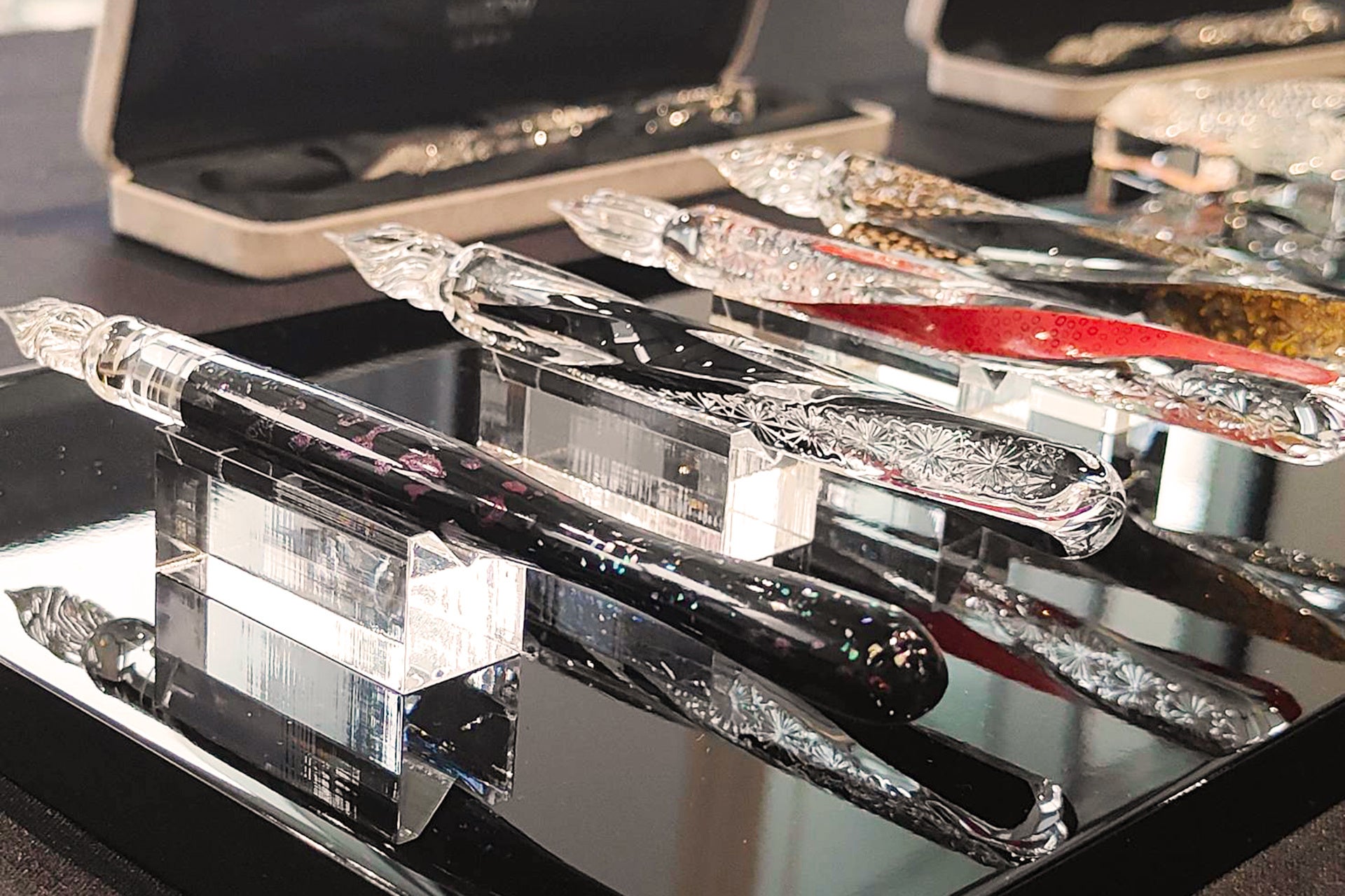 繊細で優雅な文様をガラスに刻む伝統工芸「江戸切子」をまとった特別なガラスペンで、1本1本ハンドメイドで製作されています。伝統工芸士による江戸切子のカットとデザイン、緻密なペン先の設計による書き心地など、ガラスの様々な技術を掛け合わせています。