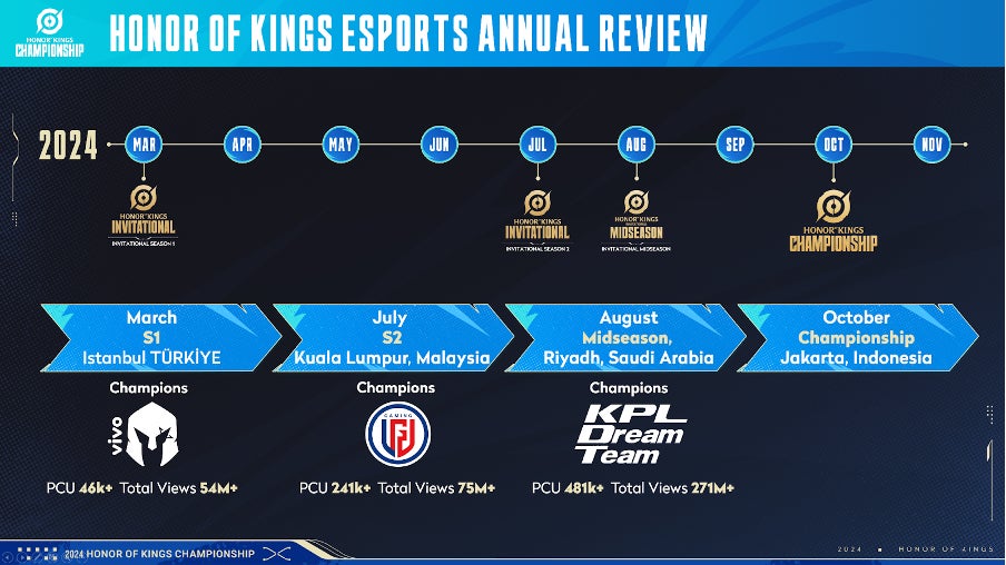 2024 Honor of Kings Championshipは、Honor of Kings eスポーツにとって真に目覚ましい年となった今年最後のグローバルイベントです。今シーズンは、スリリングなトーナメント、記録的な視聴者数、忘れられない場面が満載で、今年初めに発表されたHonor of Kings Invitationalシリーズに続き、Honor of Kingsがが世界中でHonor of Kings eスポーツの発展に尽力していることを示しました。