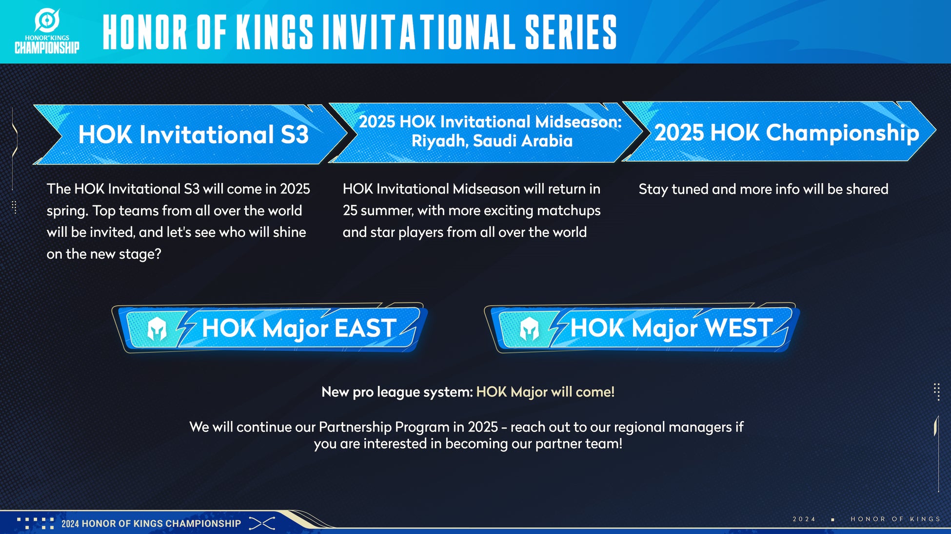 2024 Honor of Kings Championship決勝戦の後、Level Infiniteでグローバルeスポーツセンターのシニアディレクターを務めるJames Yang氏と、Level InfiniteでHonor of Kings東南アジアのパブリッシングとeスポーツのディレクターを務めるJohn Zhang氏が、2025 Honor of Kings Invitational シリーズと新しいHonor of Kings Major East and Westの公開を含む、Honor of Kings eスポーツの今後の展開について説明しました。詳細は以下の通りです: