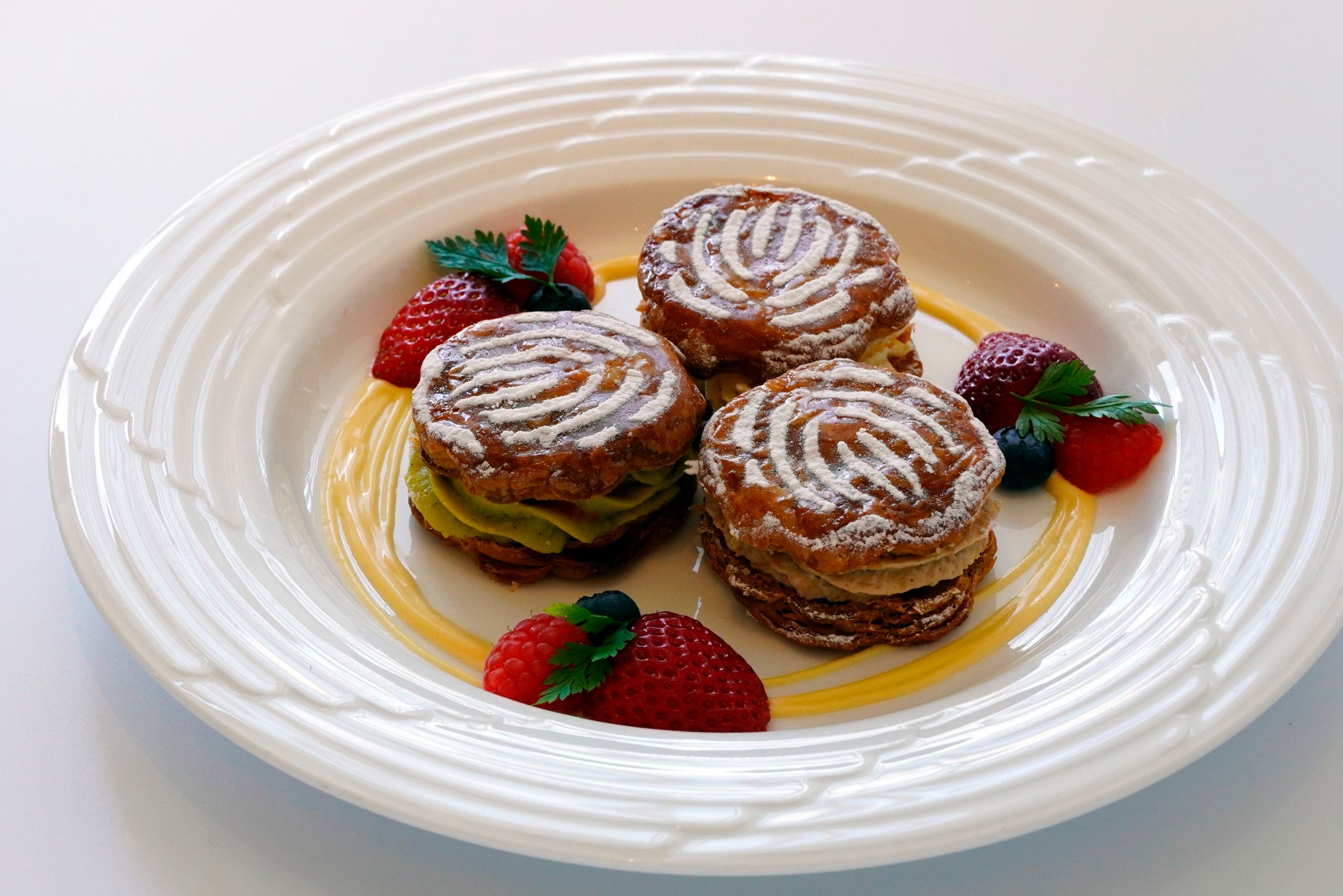 カスタードクリーム×ブルーベリージャム、紅茶カスタードクリーム×ラズベリージャム、そして、ピスタチオカスタードクリーム×ストロベリージャムの3種の組み合わせをレモンソースがすっきりまとめ上げます。