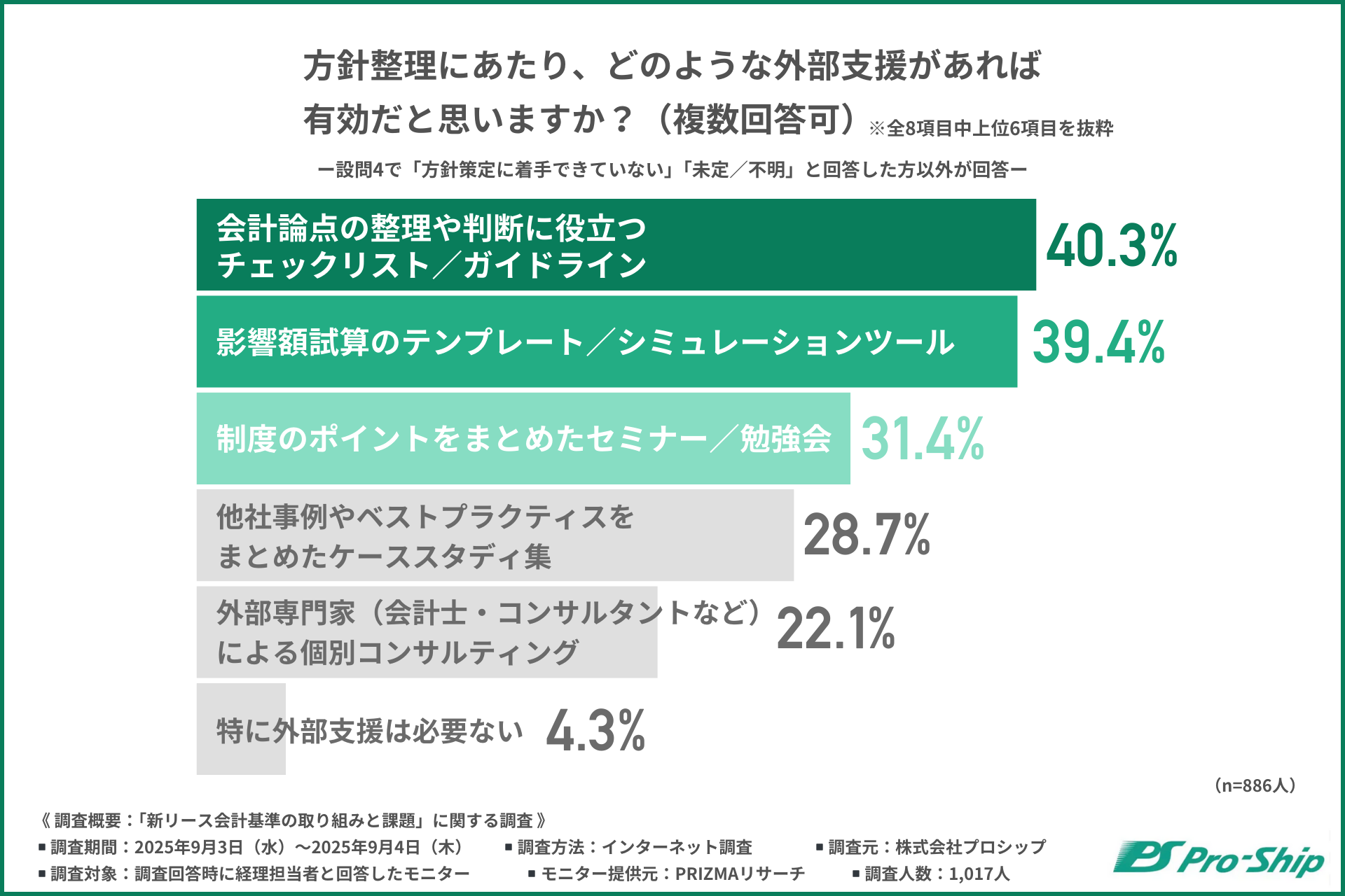 こうした新リース会計基準対応やシステム整備を進める中で、社内リソースだけでは対応が難しい場面も多く、外部支援の必要性も高まっていることが明らかになりました。
