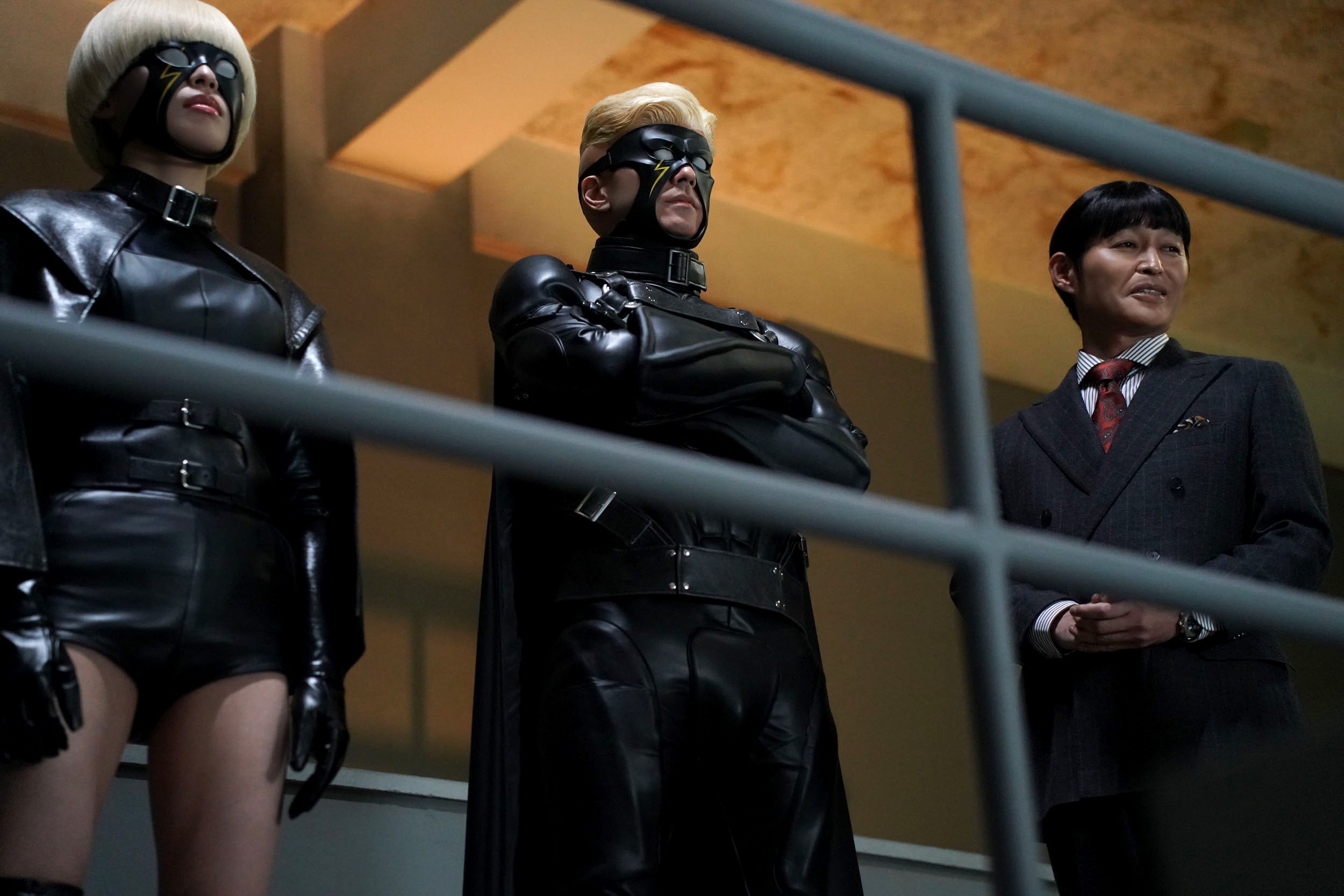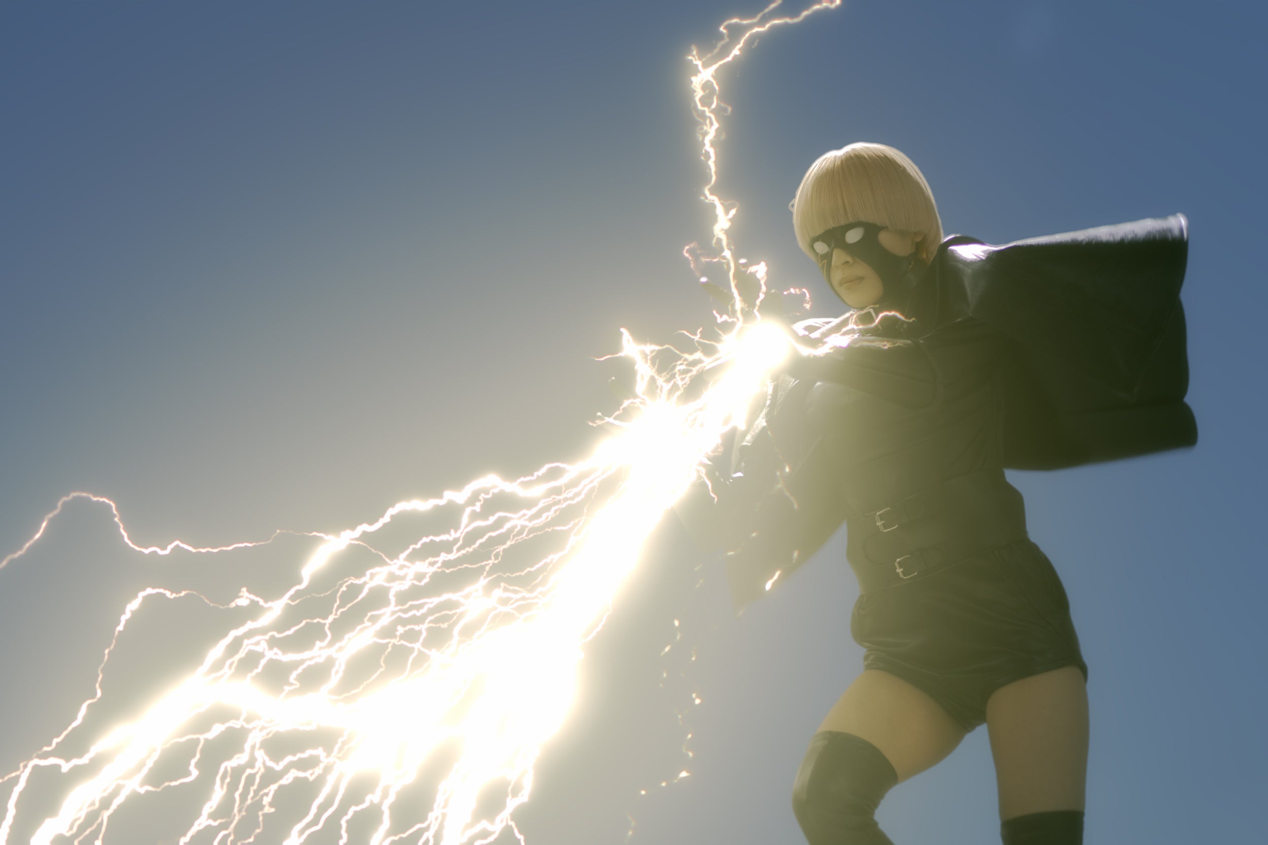 また、街の平和を守り子供たちが憧れるヒーローであるライトニングボルトやサンダーガールが電撃を放出している迫力満点の場面や、市長と固い握手を交わす平和の象徴とも称されるライトニングボルトの勇ましい姿や、冷徹な表情で中指を立てる「正義の味方」らしからぬサンダーガールの姿、神妙な面持ちでうつむく警察署長・土屋の姿も見て取れ、物語の展開が一筋縄ではいかないことも予感させる。