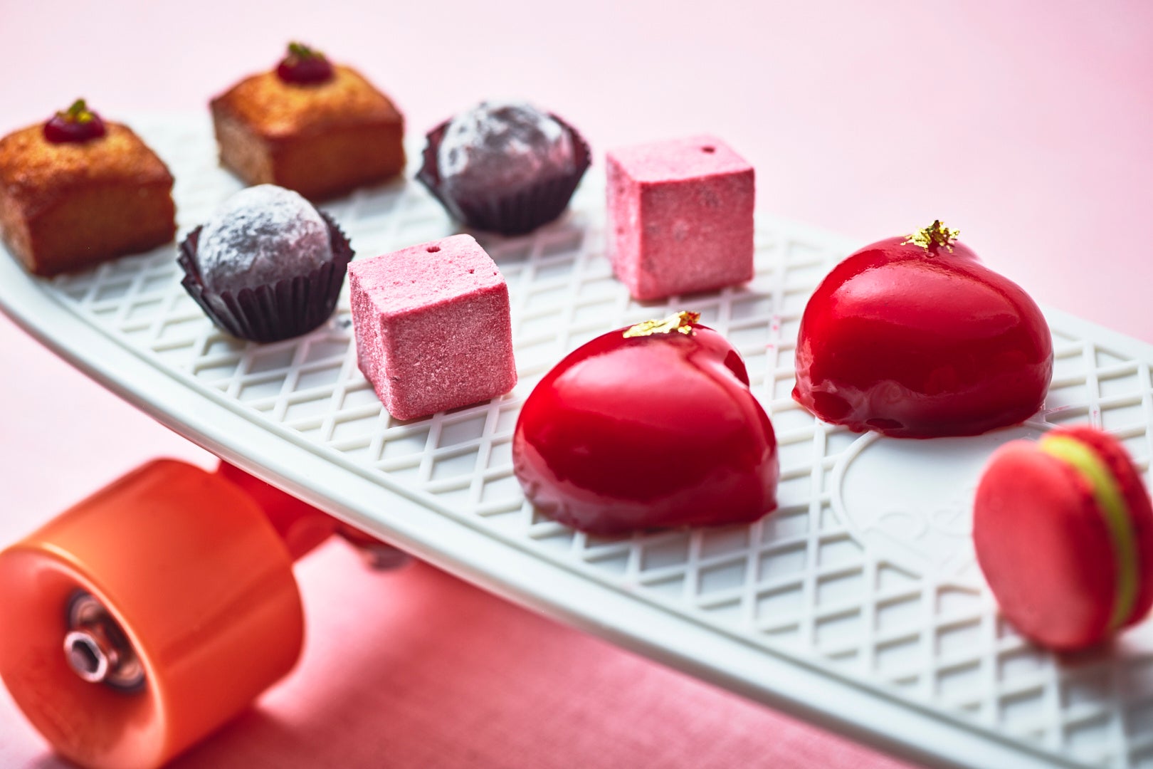 艶やかにコーティングされた「ストロベリーとピスタチオのハートムース」は、美しい装いの中でピスタチオの香ばしい香りを纏い、「トリュフとシャンパンのボンボンショコラ」は、リッチな味わいが口いっぱいに広がります。「ストロベリーホワイトチョコレートショット」はまるでシェイクを飲んでいるような、シェフの遊び心に触れるひと品。